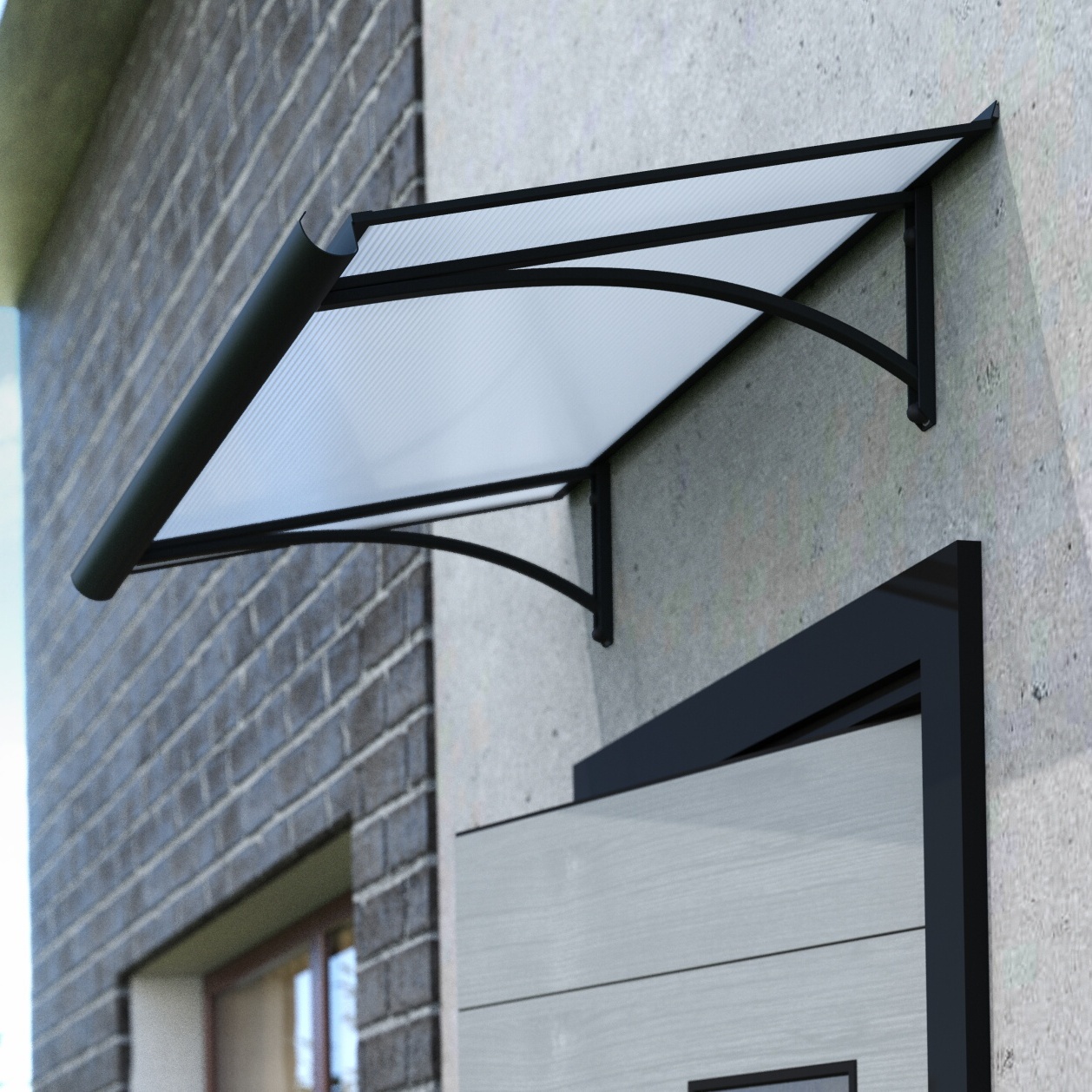 Daszek nad drzwiami wykonany z aluminium malowanego proszkowo. W przeciwieństwie do zadaszeń o konstrukcji z tworzywa sztucznego, konstrukcja aluminiowa doskonale opiera się działaniu czynników atmosferycznych, a także jest mocna i stabilna nawet po latach. Nie kruszy się zimą pod wpływem mrozu i nie zmienia koloru nawet pod wpływem silnego letniego słońca. Daszek oszklony poliwęglanem komórkowym o grubości 4,5 mm z dwustronnym filtrem UV (marka LEXAN® - produkcja Austria). Jest to bardzo wysokiej jakości markowy poliwęglan jednego z najlepszych światowych producentów.
