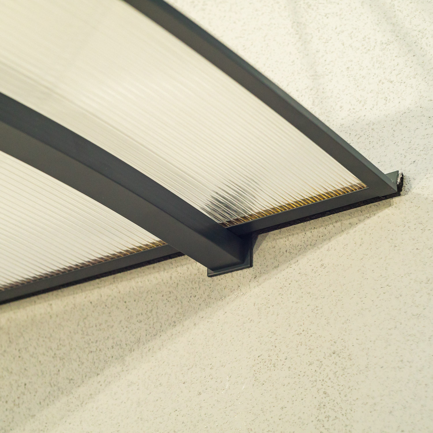 Aluminiowy baldachim wejściowy, antracyt, szer 1400 x gł 850 x wys 190 mm, przezroczysty poliwęglan komórkowy 4,5 mm.