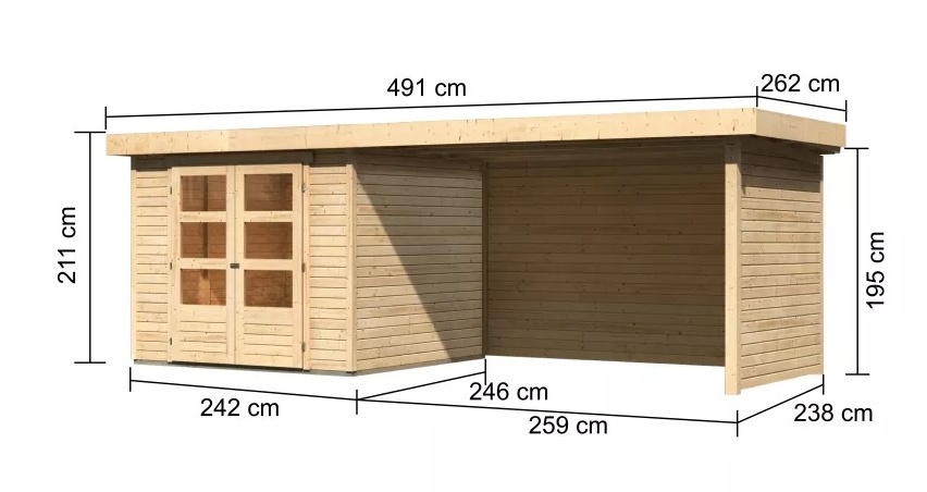 Ta wersja domku zawiera oficyna obejmujące tylną i boczną ścianę o długości 280 cm, którą można montować z prawej lub lewej strony.