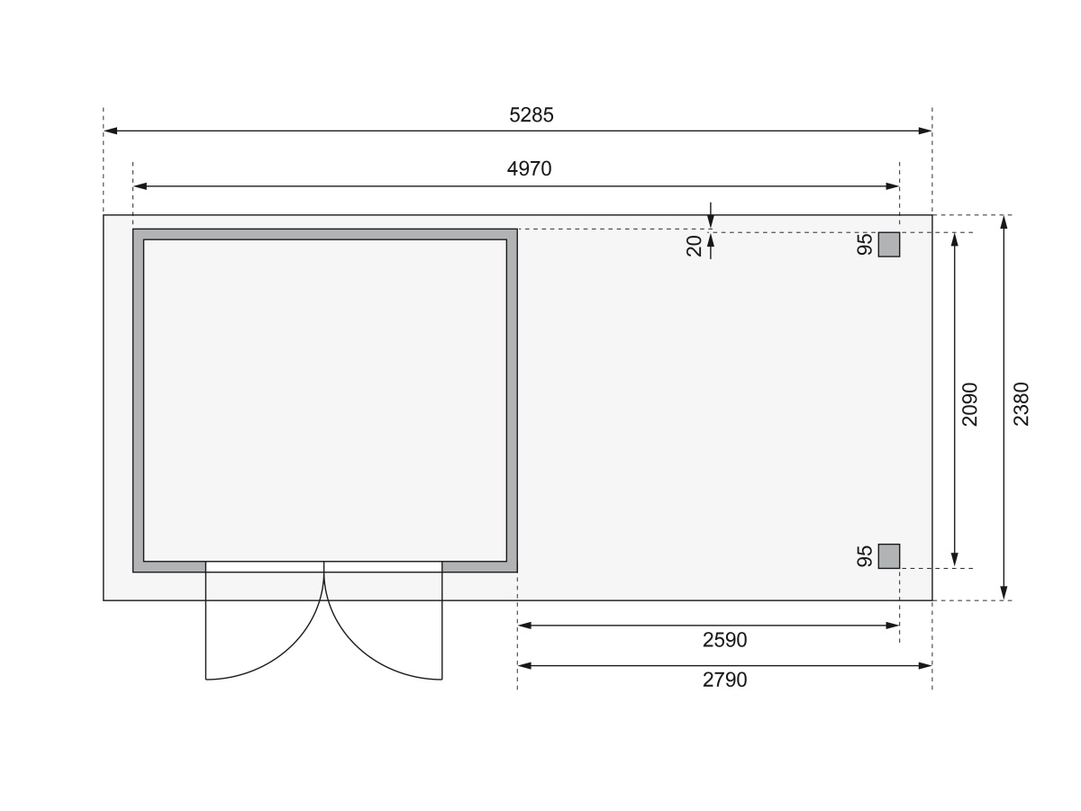 Ta wersja domku zawiera otwartą oficyna o długości 280 cm, którą można zamontować z prawej lub lewej strony.