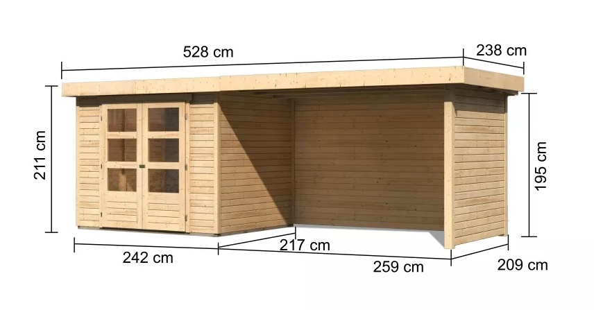 Ta wersja domku zawiera oficyna obejmujące tylną i boczną ścianę o długości 280 cm, którą można montować z prawej lub lewej strony.