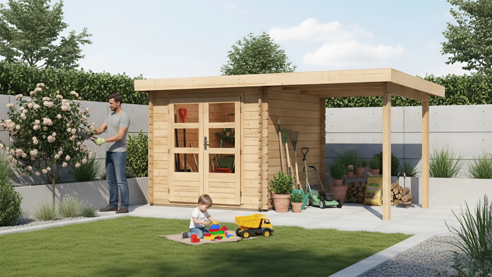 Podstawowy model drewnianego domku do ogrodu. Model ten ma płaski dach i podwójne drzwi na zawiasach z oknem w każdym skrzydle. Materiałem konstrukcyjnym domku są profile drewniane o grubości 28 mm, idealnie wyfrezowane ze świerku nordyckiego. Dostarczamy jako zestaw w stanie rozłożonym. Ogromną zaletą tej serii jest opatentowane połączenie narożne 6-Plus. Razem zapewnia to nie tylko trwałą i stabilną konstrukcję, ale także solidny ogólny wygląd. Gwarantuje to niezwykle prosty montaż, z którym poradzi sobie każdy majsterkowicz.