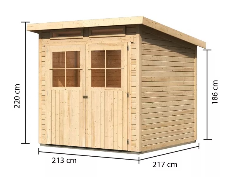 Podstawowy model drewnianego domu do Twojego ogrodu. Model ten posiada płaski dach oraz dwuskrzydłowe drzwi uchylne z oknem w każdym skrzydle. Materiałem konstrukcyjnym domu są profile drewniane o grubości 19 mm, doskonale wyfrezowane ze świerku nordyckiego. Dostarczamy go w zestawie w stanie rozłożonym, gdzie ściany składają się z pojedynczych profili drewnianych, które wystarczy złożyć i skręcić. Gwarantuje to wyjątkowo prosty montaż, z którym poradzi sobie każdy majsterkowicz.