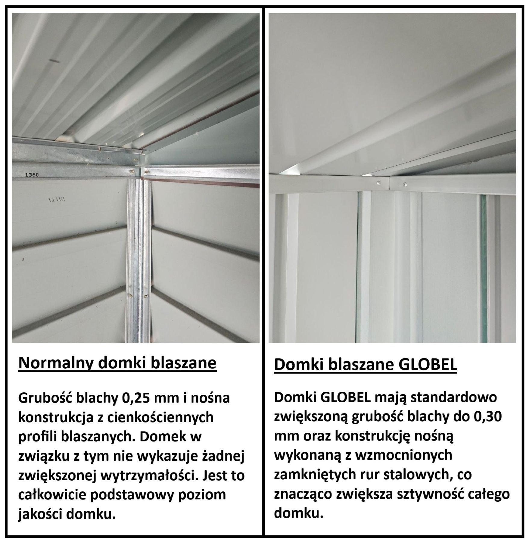 Wszystkie domy GLOBEL posiadają standardowo podwyższoną wytrzymałość blachy o grubości 0,30 mm oraz ramę nośną wykonaną ze zbrojonych zamkniętych rur stalowych (zwykłe domy na rynku czeskim i słowackim posiadają jedynie ramę nośną wykonaną z cienkościennego profilowanego pręta stalowego). Zapewnia to maksymalną wytrzymałość i stabilność całego domu. Potwierdzeniem zastosowania mocnych blach stalowych i masywnej konstrukcji nośnej jest także relatywnie większa waga domu w porównaniu do konkurentów o tej samej wielkości. Domy GLOBEL są zatem znacznie solidniejsze od innych domów innych marek i mają o około 20% większą wagę.Ten dom GLOBEL wyróżnia się spośród zwykłej produkcji wyjątkowym oświetleniem dachu. Świetlik wpuszczany stały wykonany jest w ten sposób, że jedna blaszana część dachu zostaje zastąpiona kawałkiem z włókna szklanego o tym samym rozmiarze. Dzięki świetlikowi w domu jest wystarczająco dużo światła.