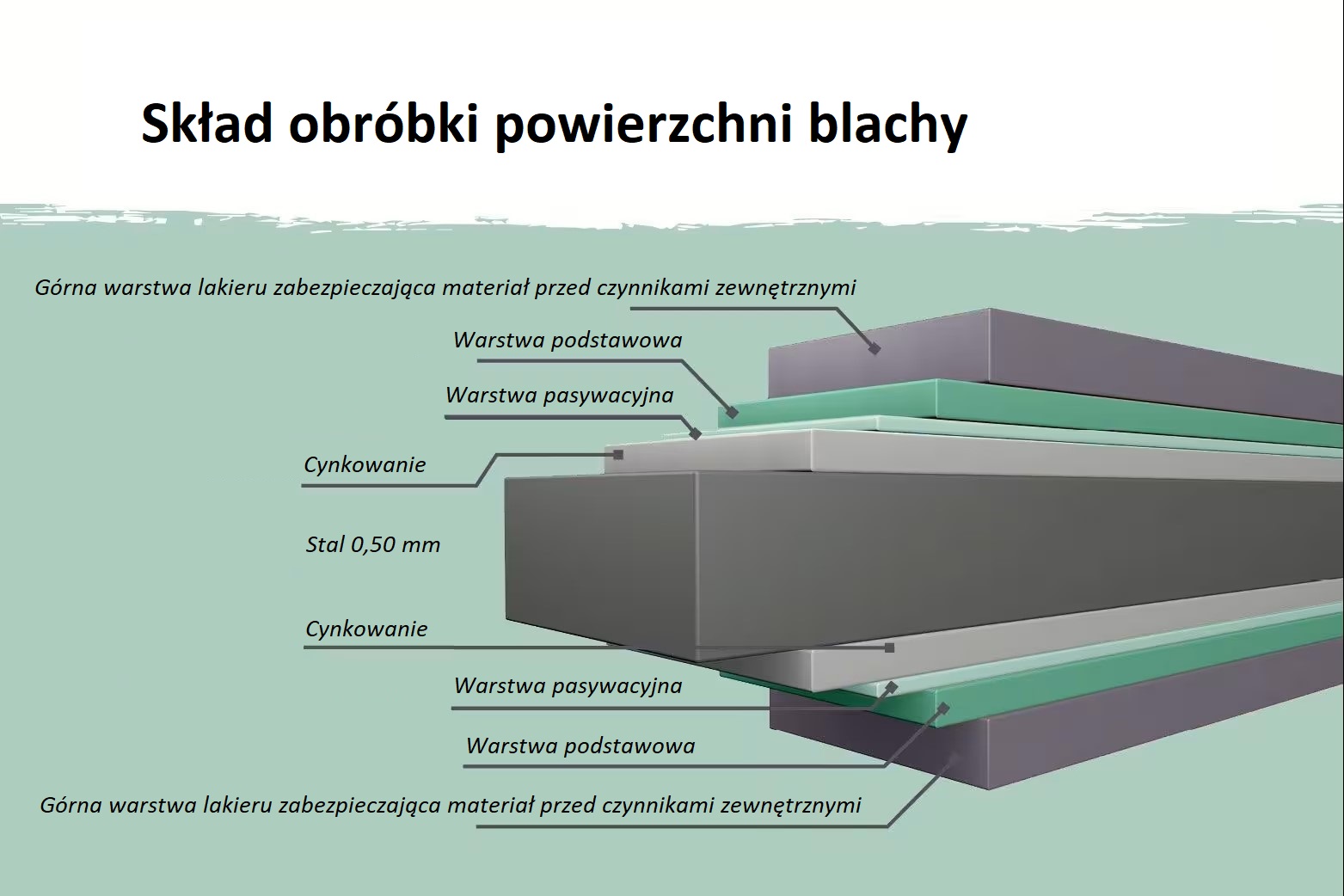 Blacha trapezowa jest starannie malowana proszkowo, co nie tylko dodaje estetyki, ale również zapewnia doskonałą odporność na niekorzystne warunki atmosferyczne. Rama wykonana z ocynkowanych rur stalowych o przekroju kwadratowym gwarantuje stabilność i wytrzymałość konstrukcji. Pas świetlny wykonany ze sztucznego szkła pozwala na przenikanie naturalnego światła do wnętrza, tworząc przyjemną, jasną i relaksującą atmosferę wewnątrz domu. W skład dostawy wchodzi rynna, która skutecznie odprowadza wodę deszczową.