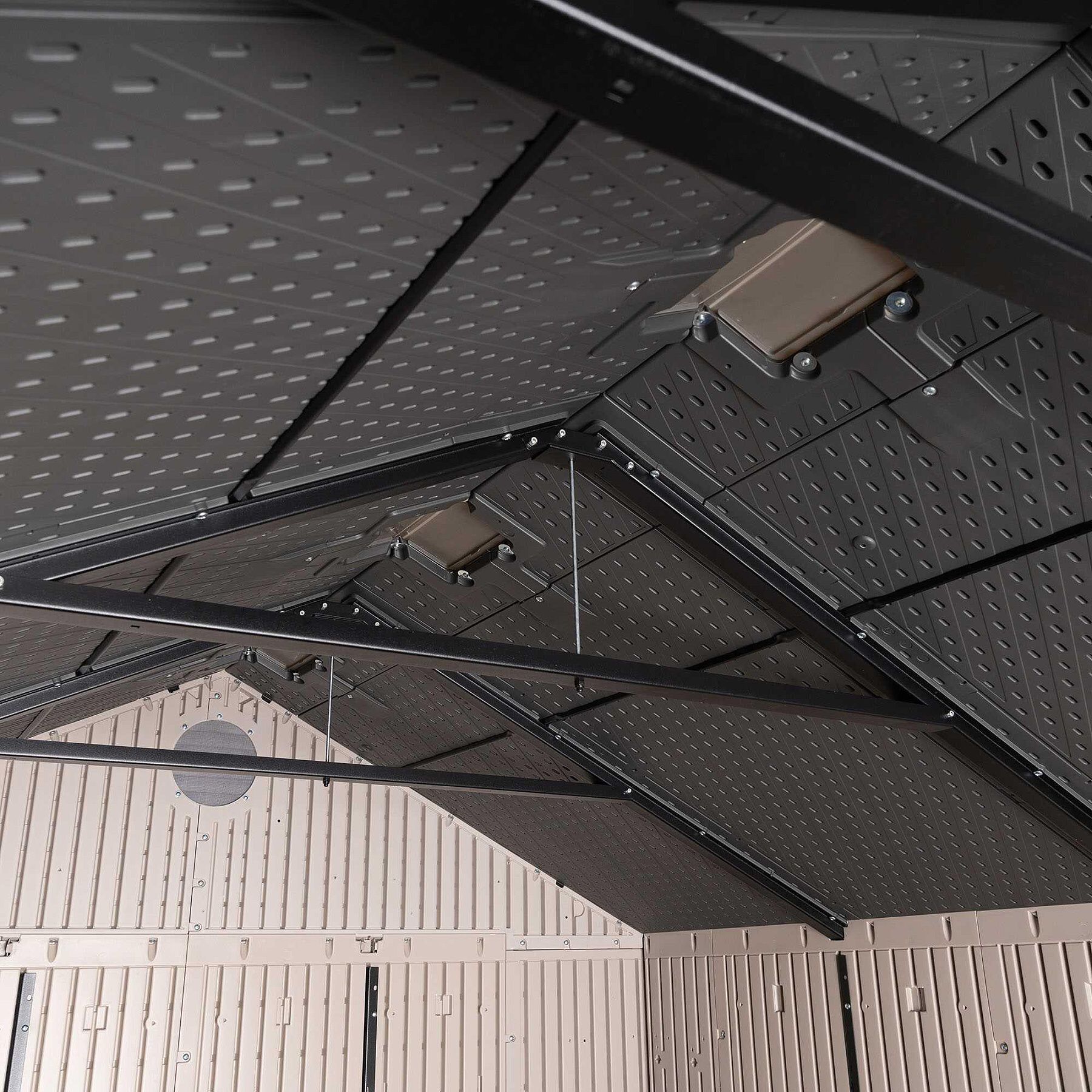 Solidny domek z tworzywa sztucznego „nowej generacji” do przechowywania artykułów ogrodniczych, sportowych, basenowych, grillowych, kempingowych, motoryzacyjnych i innych artykułów ogrodniczych. Nowoczesny design, łatwy montaż, zastosowanie całoroczne. Domek ogrodowy ma metalową konstrukcję nośną, a podwójne ściany, dach, podwójne drzwi i podłoga wykonane są z masywnego, bardzo wytrzymałego i praktycznie nietłukącego się tworzywa sztucznego. Plastikowa podłoga antypoślizgowa jest częścią domu (wliczona w cenę). Dom wyposażony jest w podwójne drzwi na zawiasach. Grubość podwójnej ścianki z tworzywa sztucznego wynosi 26 mm. Nachylenie dachu wynosi 30o, co znacznie zmniejsza ilość i nacisk śniegu na dach. Materiał, z którego wykonany jest dom (wyjątkowo wytrzymały polietylen z filtrem UV) nie żółknie i nie kruszy się, dzięki czemu nie ma konieczności częstego malowania domu, jak to jest konieczne w przypadku np. domów drewnianych – w praktyce sprawdza się domek ogrodowy z tworzywa sztucznego bezobsługowy. Dom został zaprojektowany i wykonany w taki sposób, aby montaż był możliwie prosty i krótki. Po prostu zatrzaskujesz poszczególne części w sąsiednich częściach i zabezpieczasz połączenie śrubą.