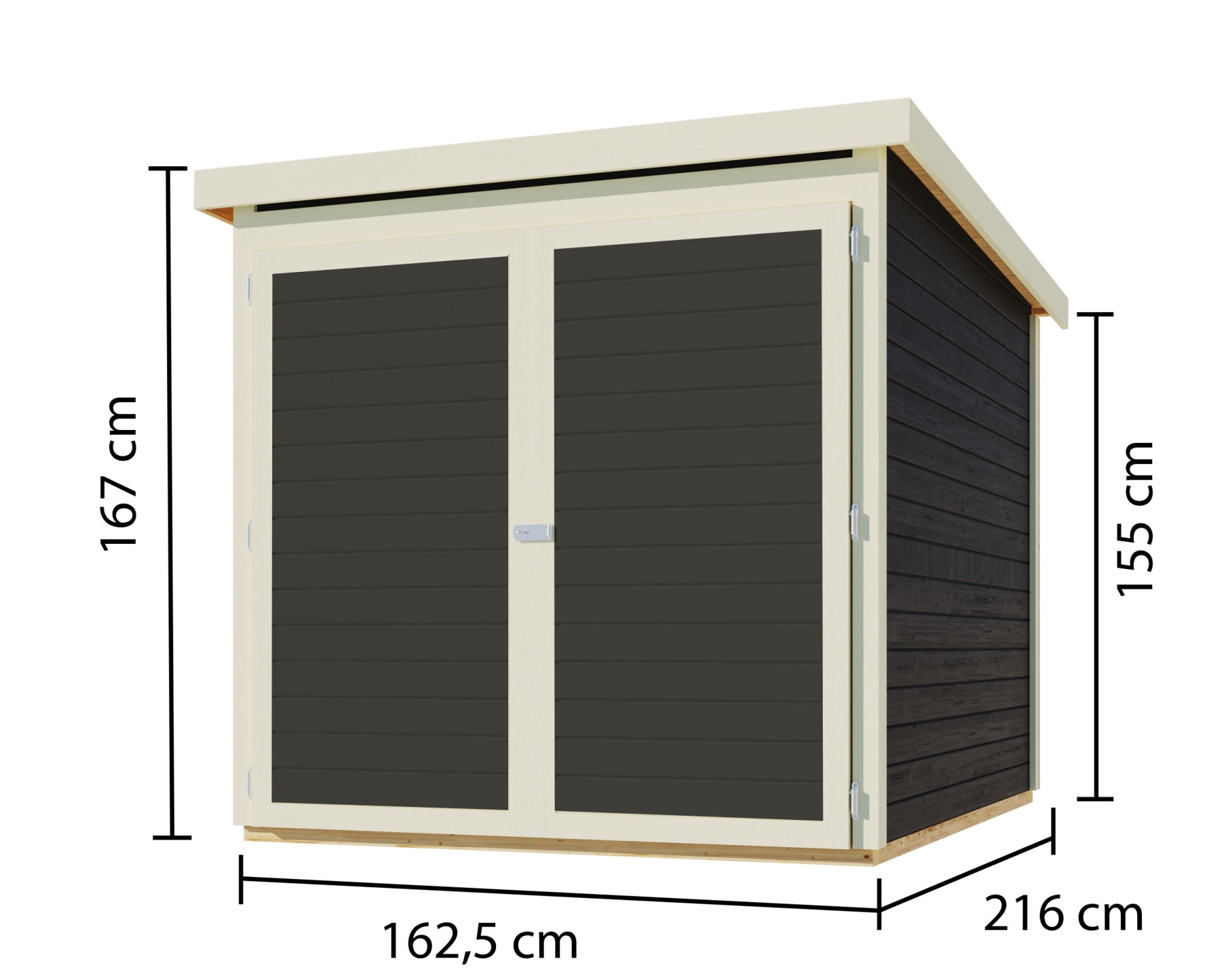 Drewniany garaż rowerowy, grubość ściany 19 mm, wymiary sz 162 x gł 216 cm, powierzchnia zewnętrzna 3,5 m2.