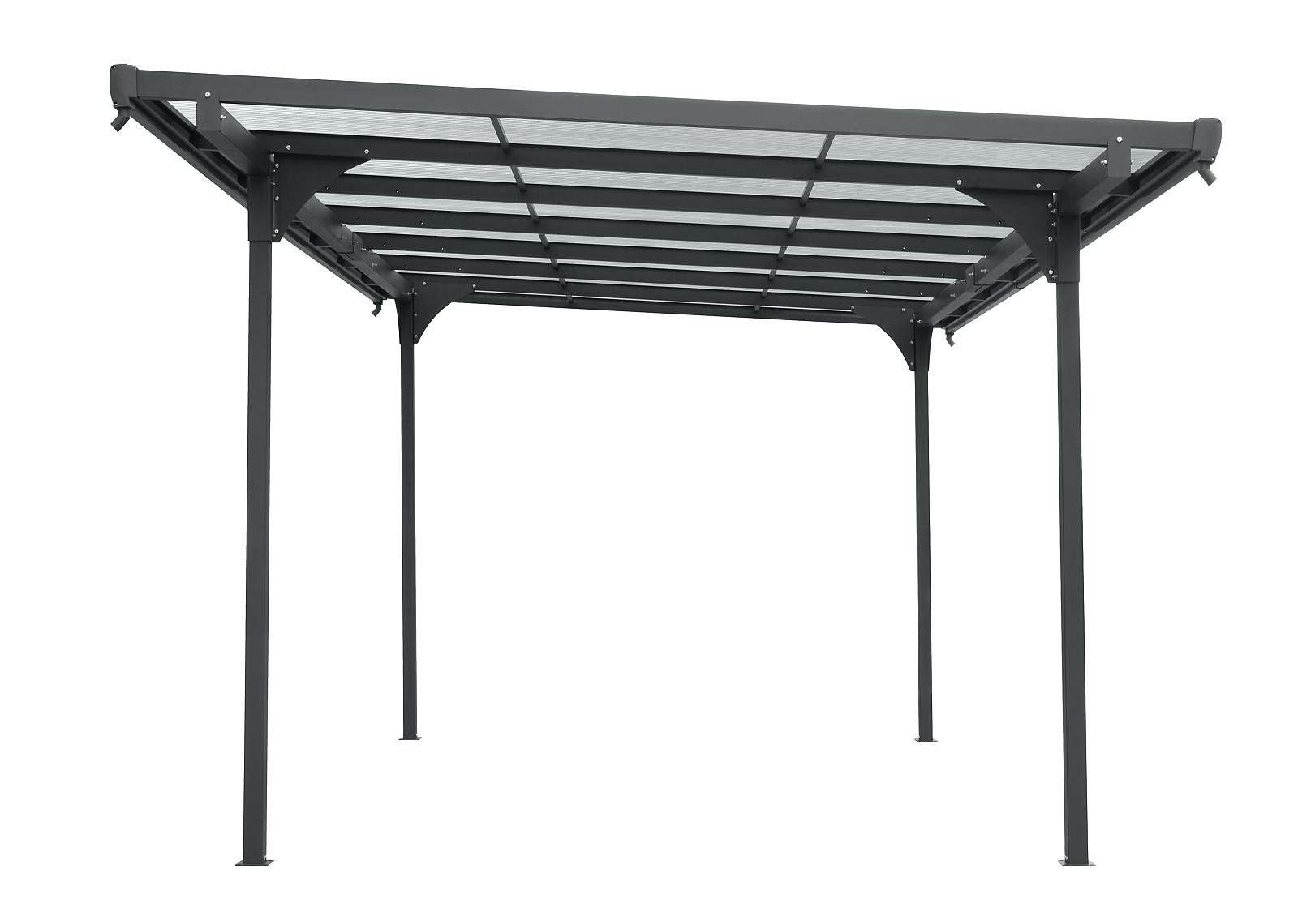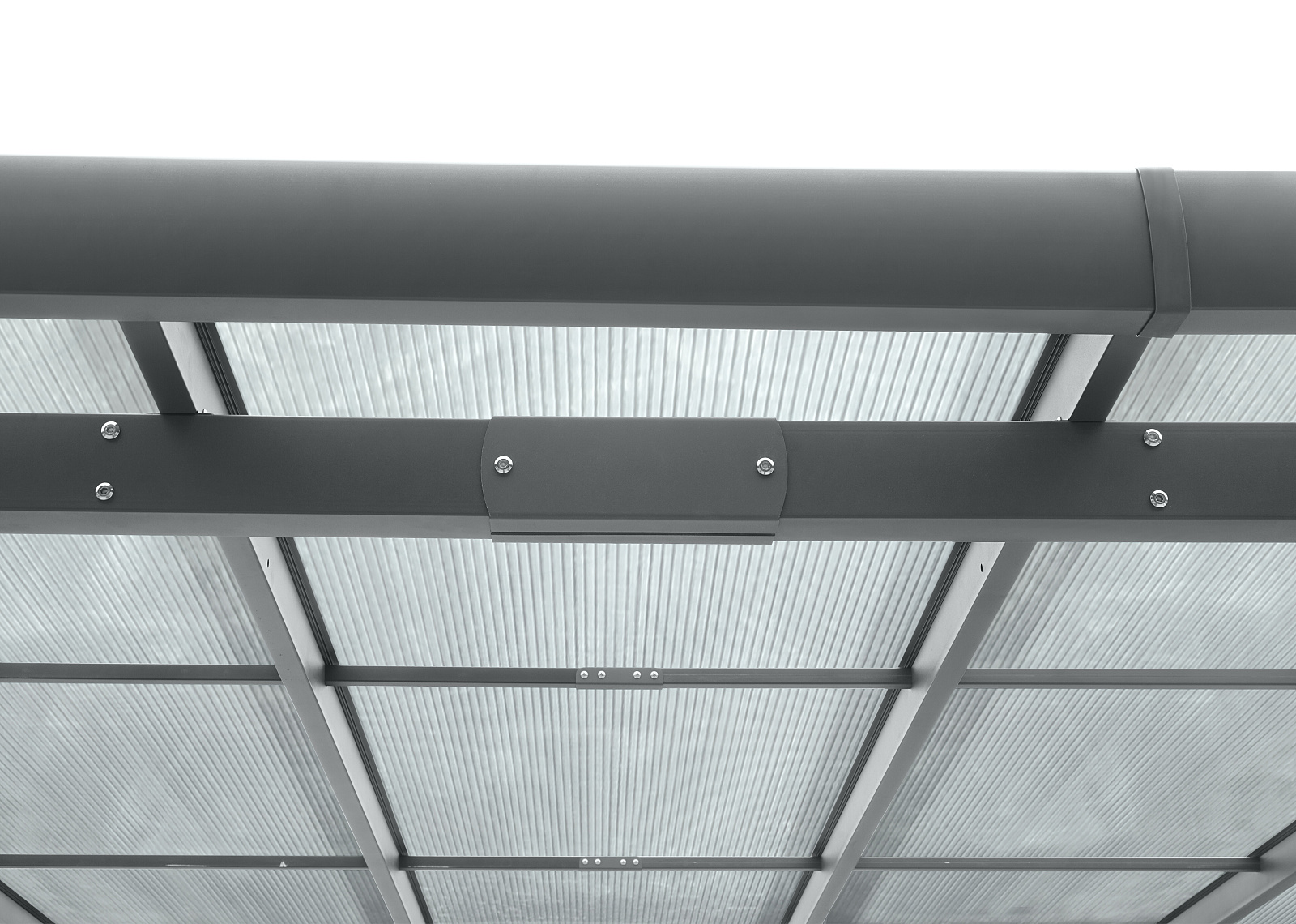 Stalowa pergola ogrodowa z dachem z poliwęglanu. Konstrukcja pergoli wykonana jest z ocynkowanych profili stalowych, natryskiwanych wysokiej jakości farbą proszkową (komaxit), dzięki czemu jest odporna na naturalne warunki atmosferyczne przez długi czas. Dach wykonany jest z wysokiej jakości brytyjskich płyt poliwęglanowych o grubości 6 mm, które oferujemy w 2 odcieniach – przezroczystym lub dymnym brązie (BRONZE). Listwy do mocowania przeszkleń poliwęglanowych oraz listwy krawędziowe wykonane są z aluminium o takim samym wykończeniu powierzchni. Aby zagwarantować najwyższą jakość, zastosowano wysokiej jakości poliwęglan MARLON (producent Brett Martin Great Britain), który przeszedł rygorystyczne testy w czeskich akredytowanych laboratoriach badawczych jako materiał budowlany. Umowna, przedłużona, 10-letnia gwarancja na odporność poliwęglanu na grad jest oczywistością dla produktów LANIT PLAST.
