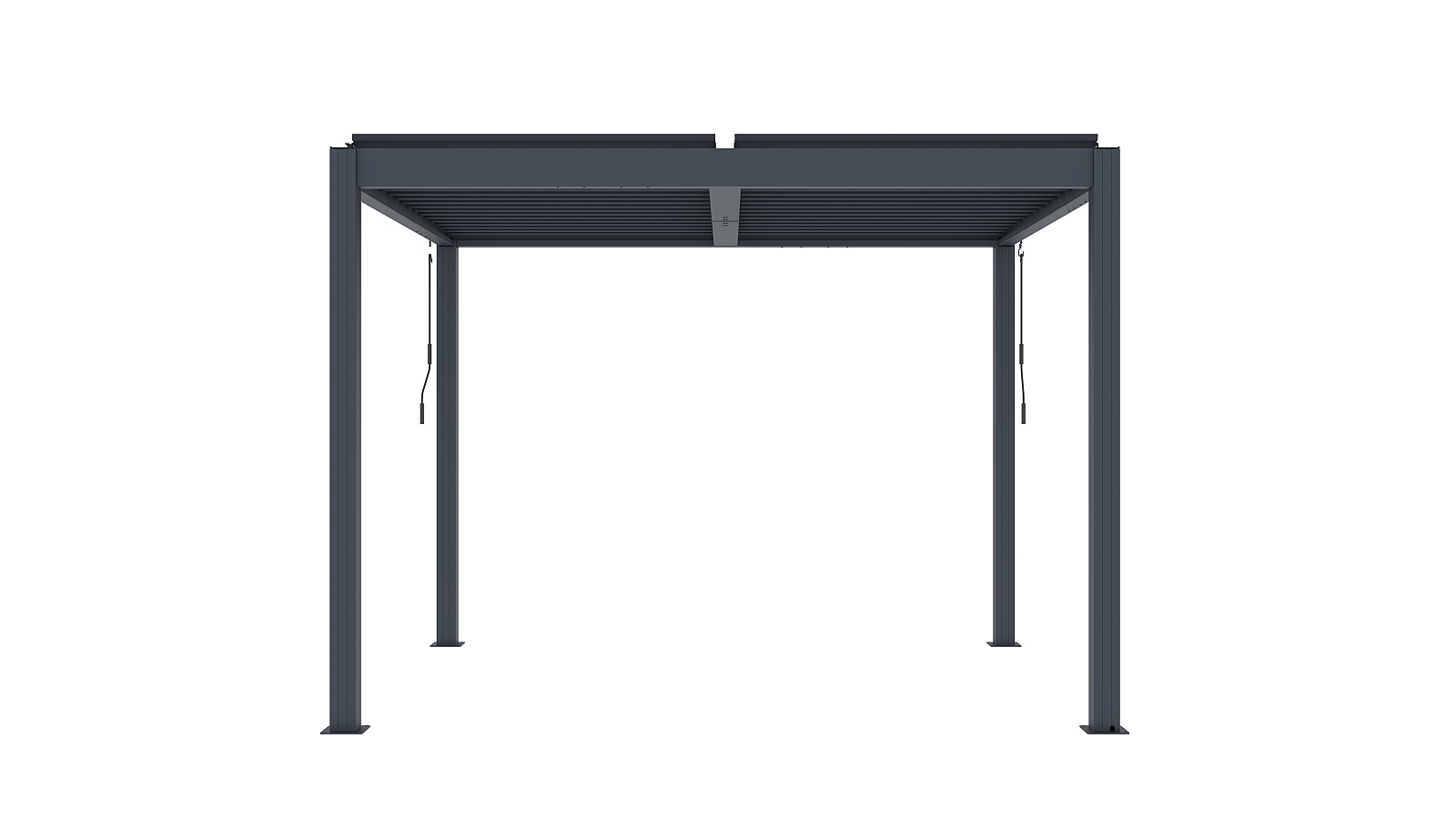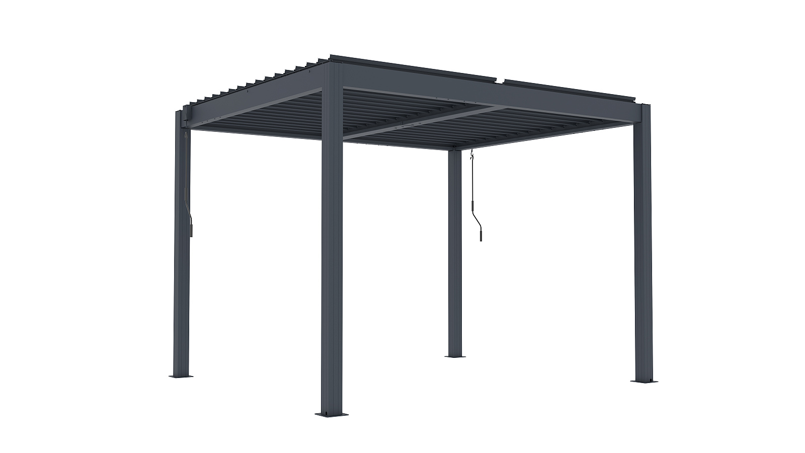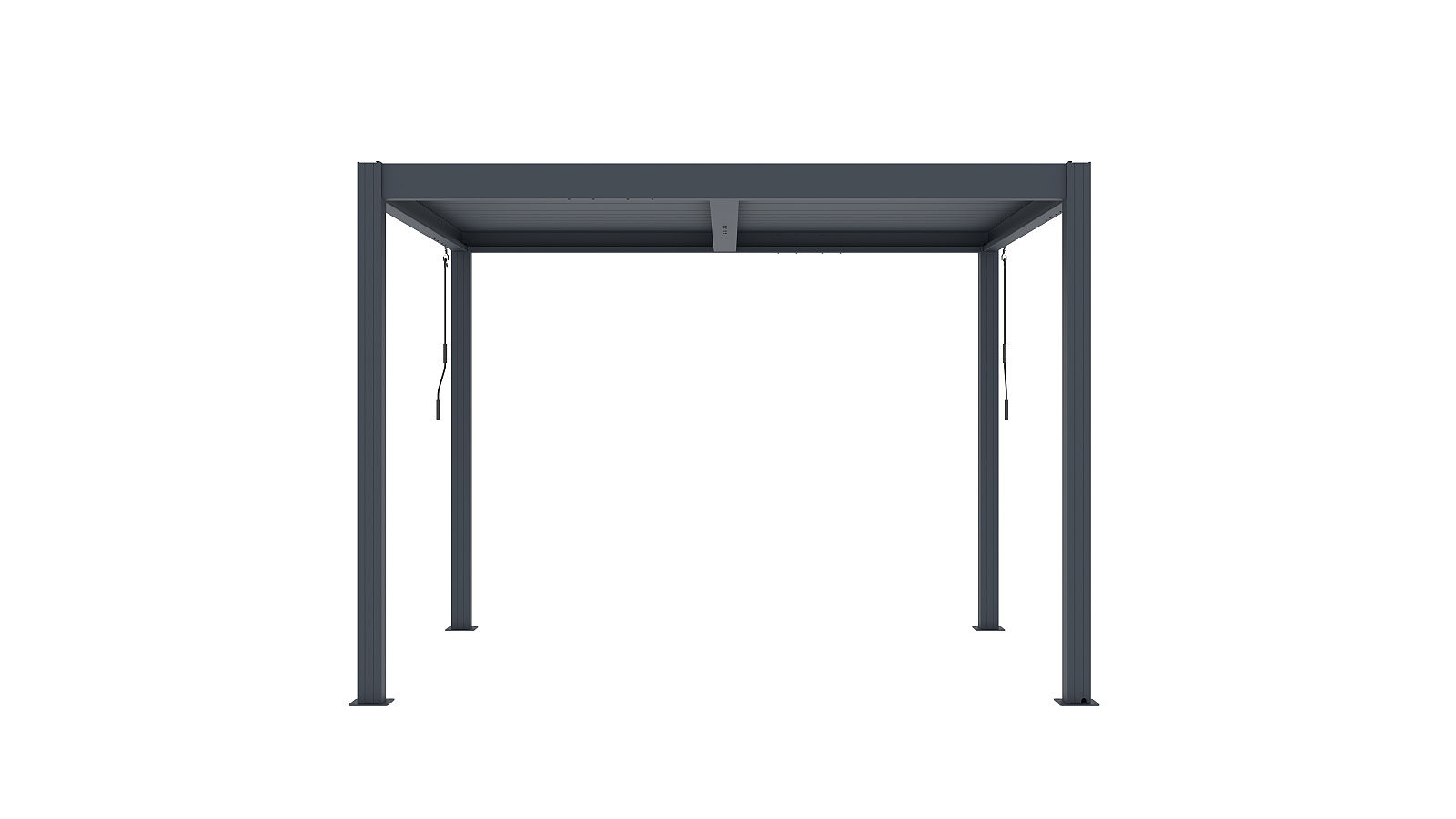 Podstawowa wersja pergoli aluminiowej BIOCLIMATIC o wymiarach sz 3,04 x gł 2,59 x w 2,20 m, kolor antracyt, płaski dach lamelowy obsługiwany ręcznie.
