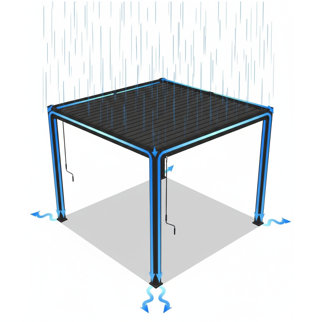 Podstawowym zadaniem lameli dachowych pergoli LANITPLAST BIOCLIMATIC BASIC jest regulacja intensywności zacienienia, jednak zamknięty dach obrotowy zapewnia również ochronę przed deszczem. Po całkowitym zamknięciu dachu lamele dachowe są ze sobą połączone (system pióro-wpust). Odprowadzanie wody zapewnia unikalny system drenażowy zintegrowany bezpośrednio z konstrukcją. W okresie zimowym konieczne jest pozostawienie lameli w pozycji pionowej, w przeciwnym razie mogą ulec uszkodzeniu. Mimo to są one w stanie wytrzymać pokrycie śnieżne o wysokości 10–15 cm, co odpowiada obciążeniu około 30 kg/m².