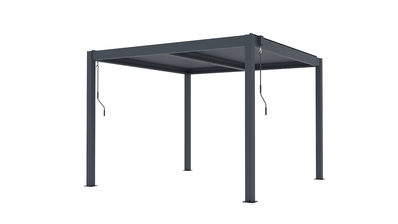 Podstawowa wersja pergoli aluminiowej BIOCLIMATIC o sz 3,04 x gł 3,04 x w 2,20 m, kolor antracyt, płaski dach lamelowy obsługiwany ręcznie.