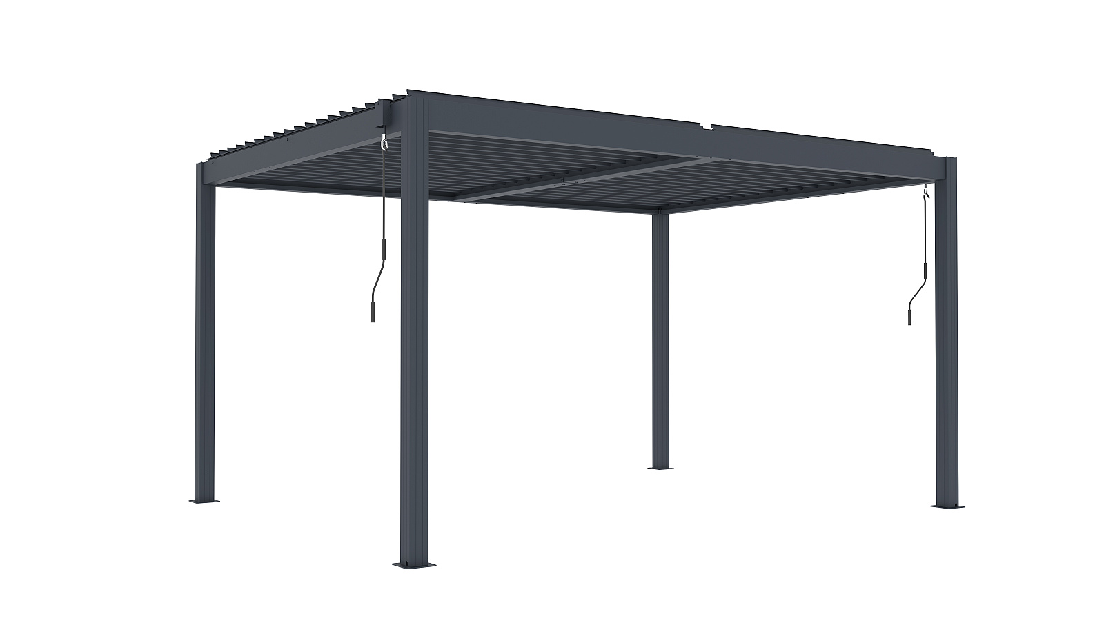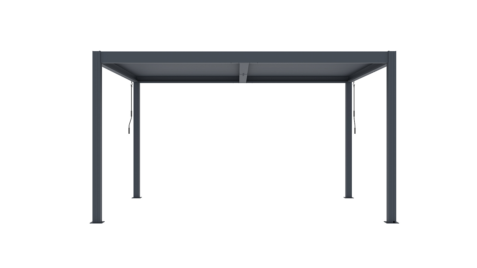 Podstawowa wersja pergoli aluminiowej BIOCLIMATIC o sz 3,95 x gł 3,05 x w 2,20 m, kolor antracyt, płaski dach lamelowy obsługiwany ręcznie.