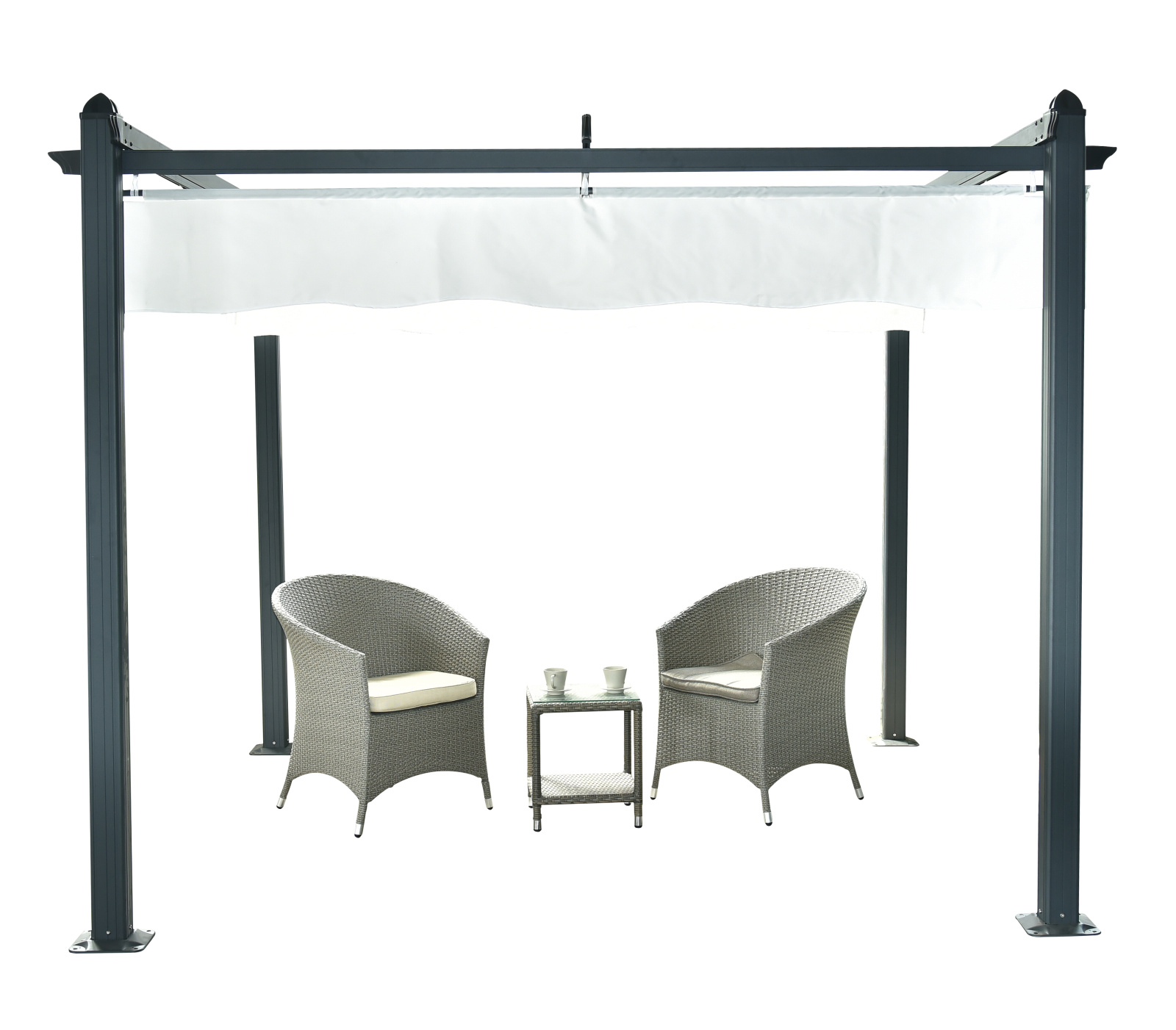 Pergola aluminiowa, szer 2,92 x gł 2,92 x wys 2,28 m, kolor antracyt, rozsuwany dach brezentowy, powierzchnia 8,53 m2.