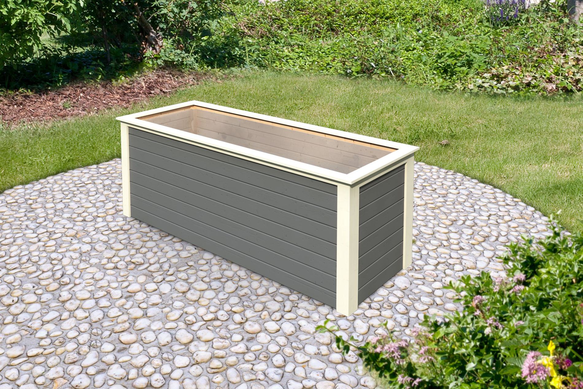 Podniesiony drewniany kwietnik KARIBU, sz 254 x gł 94 x w 92 cm, profile drewniane w kolorze szarym 28 mm, skrzynka ogrodowa nie posiada dna.