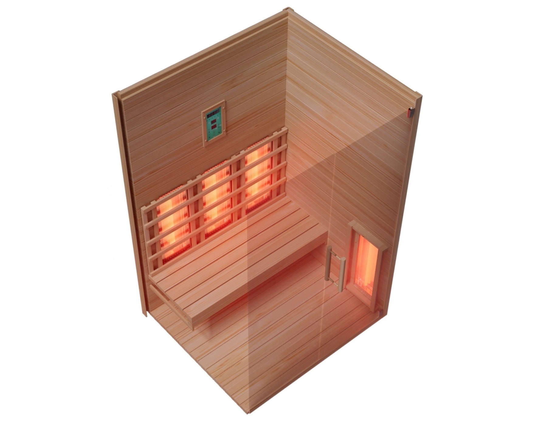 - 6x redlight grzejnik (3x tył, 1x przód lewy, 1x przód prawy, 1x pod ławką) z ekstra dużymi parabolicznymi lustrami w celu maksymalizacji wydajności i idealnego ukierunkowania szerokospektralnego promieniowania podczerwonego typu IR-A, IR-B i IR-C