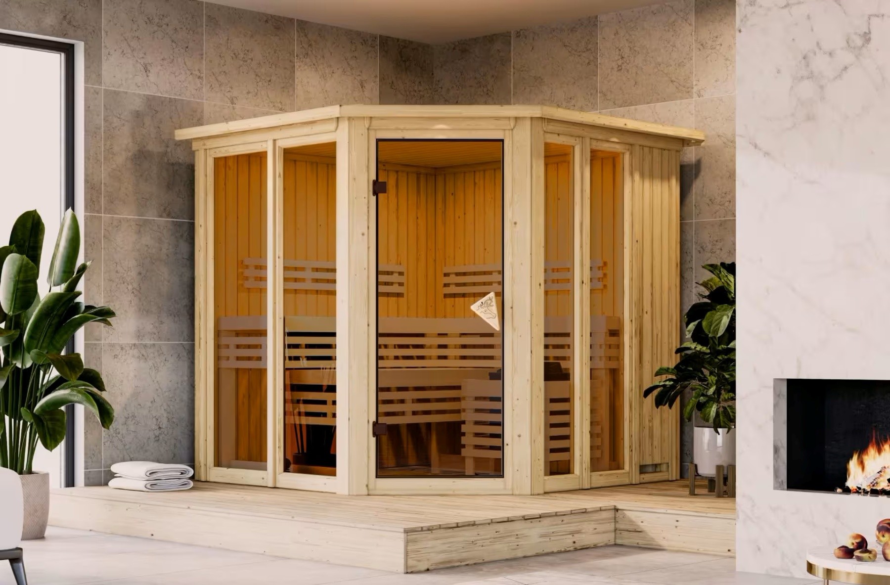 Sauna fińska przeznaczona dla dwóch osób leżących. Wymiary: sz 196 x gł 196 x w 198 cm z drzwiami narożnymi. Ten model sauny fińskiej posiada 4x stałe okna. Sauna przeznaczona jest do ogrzewanych wnętrz domu lub mieszkania. Producent, firma KARIBU HOLZTECHNIK z Bremy w Niemczech, w swoich produktach z powodzeniem nawiązuje do wielowiekowej tradycji skandynawskiej sauny, a jednocześnie stosuje dzisiejsze, nowoczesne technologie.
