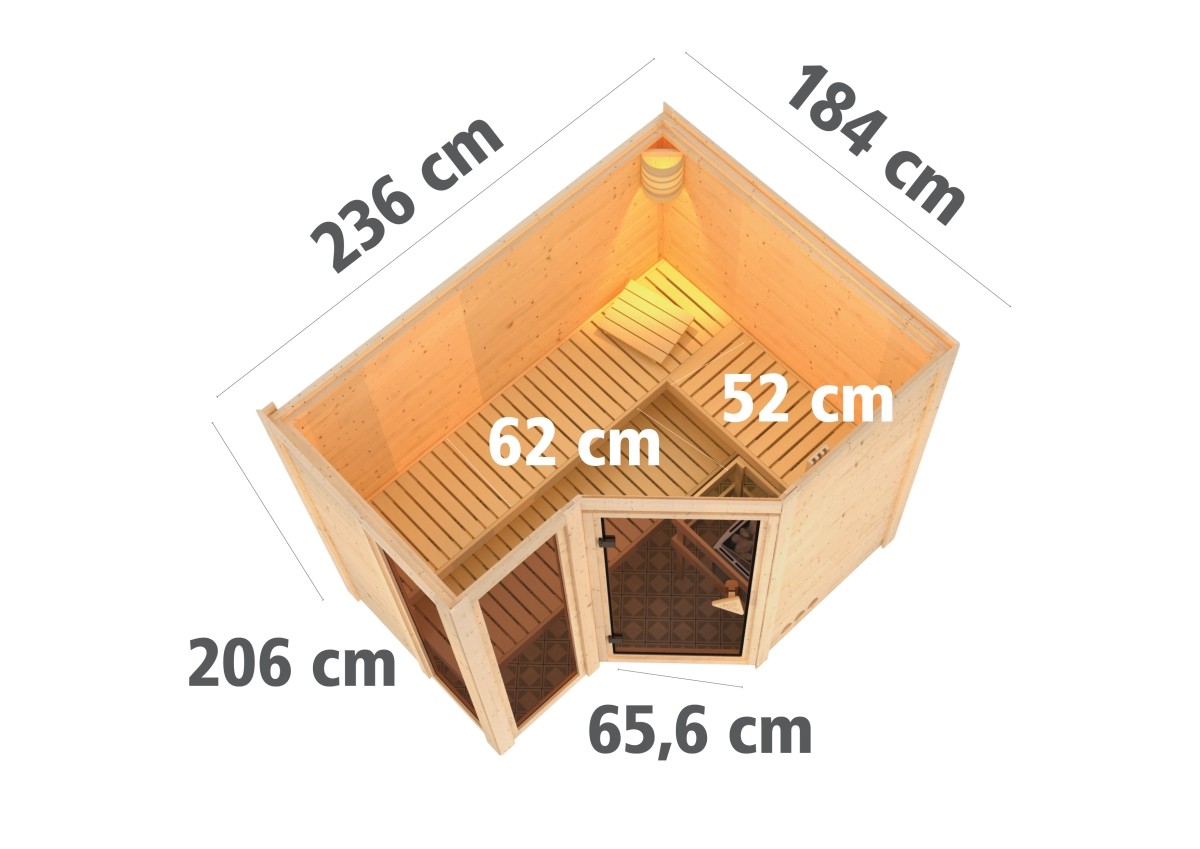 Finská sauna przeznaczona dla trzech osób w pozycji leżącej. Wymiary: sz 236 cm, gł 184 cm, w 209 cm. Ten model sauny fińskiej jest przeznaczony do ogrzewanych wnętrz domu lub mieszkania. Jej producent, firma KARIBU HOLZTECHNIK z niemieckiego Bremy, z powodzeniem nawiązała swoimi produktami do wielowiekowej tradycji skandynawskiego saunowania, jednocześnie wprowadzając do niej nowoczesne technologie. Sauna jest w całości wykonana z drewna świerku skandynawskiego w naturalnym wykończeniu. Drewno pochodzi z odległej północy Europy i jest całkowicie nieprzetworzone chemicznie (nie jest ani impregnowane, ani lakierowane). W efekcie jest wolne od wszelkich znanych substancji problematycznych, które mogłyby uwalniać się z drewna podczas saunowania. Ta sauna wewnętrzna jest wykonana z litego drewna o grubości 40 mm. Ściany sauny składają się ze specjalnie wygładzonych desek z podwójnym piórem i wpustem, co gwarantuje niezwykłą wytrzymałość połączeń.