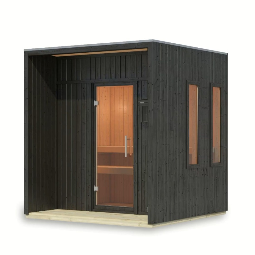 Ta stylowa sauna zewnętrzna o kompaktowych wymiarach 220 × 217 cm to idealne miejsce do relaksu i regeneracji w Twoim ogrodzie. Dzięki wstępnie zmontowanym panelom jej montaż jest wyjątkowo prosty i szybki. Modułowa konstrukcja zachwyca nie tylko wysoką jakością wykonania, ale także doskonałą izolacją termiczną: elementy ścienne o grubości 73 mm wypełnione są wełną mineralną, co zapewnia równomierne i przyjemne ciepło także przy niskich temperaturach zewnętrznych. Drzwi całkowicie przeszklone i dwa duże okna zapewniają mnóstwo światła dziennego i pozwalają na kontakt z otaczającą przyrodą. Wnętrze wyposażono w dwa wygodne leżaki z drewna osikowego, a elegancki płaski dach z aluminiowymi wykończeniami podkreśla nowoczesny wygląd. Przed sauną znajduje się niewielki taras wykonany z impregnowanych desek - idealny do ochłody i zaczerpnięcia świeżego powietrza. Sauna ta jest idealnym wyborem dla każdego, kto szuka prywatnej chwili relaksu i odnowy biologicznej. Z pewnością doceni on łatwość i szybkość montażu.