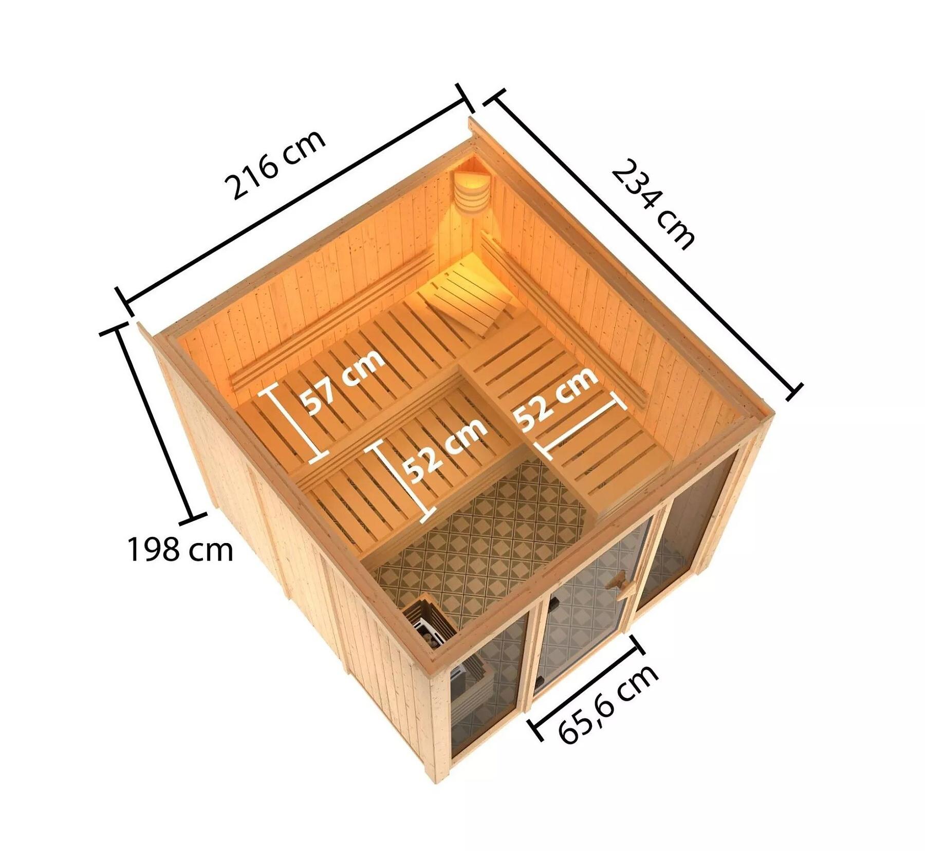 Fińska sauna przeznaczona dla trzech osób. Ma wymiary sz 216 x gł 234 x w 198 cm. Ten model sauny fińskiej jest przeznaczony do ogrzewanych wnętrz domu lub mieszkania. Jej producent, firma KARIBU HOLZTECHNIK z niemieckich Brem, z powodzeniem nawiązał swoimi produktami do wielowiekowej tradycji skandynawskiego saunowania, jednocześnie wdrażając nowoczesne technologie. Sauna jest w całości wykonana z drewna świerku skandynawskiego w naturalnym wykończeniu. Drewno pochodzi z dalekiej północy Europy i jest całkowicie niepoddane obróbce chemicznej (nie jest ani bejcowane, ani lakierowane). Dzięki temu jest wolne od wszystkich znanych szkodliwych substancji, które mogłyby uwalniać się z drewna podczas saunowania.Ta sauna wewnętrzna charakteryzuje się wyjątkowymi właściwościami termoizolacyjnymi. Ściany sauny składają się z wewnętrznej i zewnętrznej warstwy specjalnie wygładzonych desek z piórem i wpustem, pomiędzy którymi znajduje się 42-milimetrowa izolacja termiczna z wełny mineralnej. Całkowita grubość ściany wynosi zatem 68 mm. Tylne lub boczne niewidoczne strony, skierowane ku ścianie pomieszczenia, mają zewnętrzną stronę wykonaną z płyty pilśniowej. Dlatego przy tej samej izolacji termicznej są o około 10 mm cieńsze niż widoczne strony pokryte boazerią.