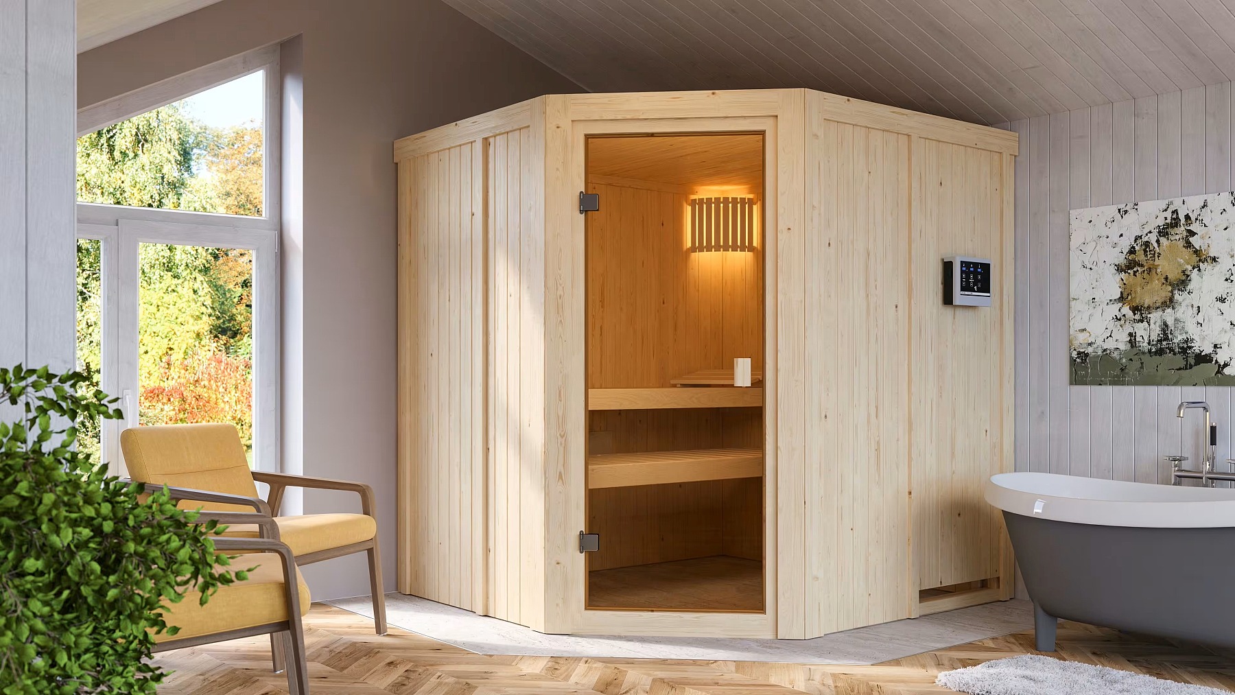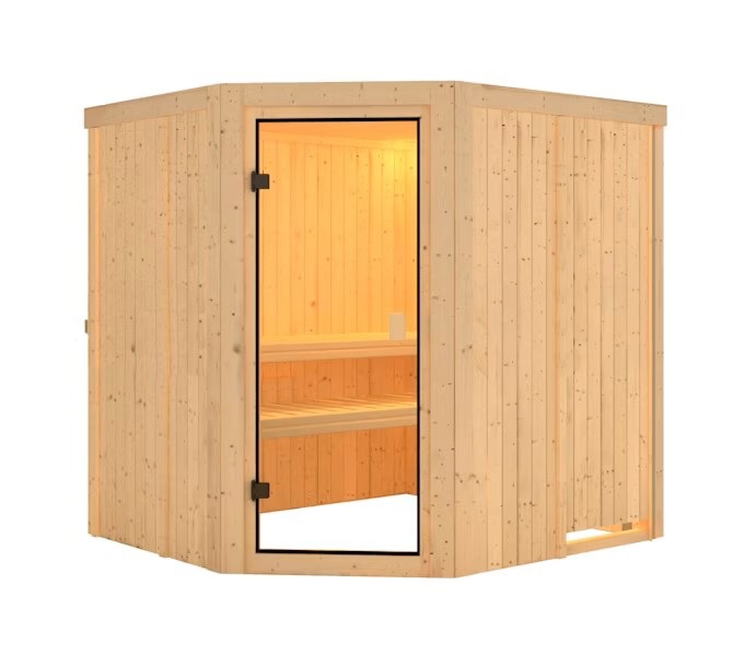 Finska sauna przeznaczona dla dwóch osób leżących. Ma wymiary: sz 196 x gł 178 x w 198 cm z narożnymi drzwiami. Model tej sauny fińskiej jest przeznaczony do ogrzewanych wnętrz domów lub mieszkań. Jej producent, firma KARIBU HOLZTECHNIK z niemieckich Brem, z powodzeniem nawiązała swoimi produktami do wielowiekowej tradycji skandynawskiego saunowania, jednocześnie wprowadzając nowoczesne technologie. Sauna jest w całości wykonana z drewna świerka skandynawskiego w naturalnym wykończeniu. Drewno pochodzi z dalekiej północy Europy i jest całkowicie nieprzetworzone chemicznie (nie jest bejcowane ani lakierowane). Dzięki temu jest wolne od wszystkich znanych problematycznych substancji, które mogłyby się uwalniać z drewna podczas saunowania. Ta sauna do wnętrz wyróżnia się wyjątkowymi właściwościami termoizolacyjnymi. Ściany sauny składają się z wewnętrznej i zewnętrznej warstwy specjalnie wygładzonych desek z piórem i wpustem, między którymi znajduje się 42-milimetrowa warstwa termoizolacyjna z wełny mineralnej. Całkowita grubość ściany wynosi zatem 68 mm. Tylne lub boczne niewidoczne strony, zwrócone w stronę ściany pomieszczenia, mają zewnętrzną warstwę wykonaną z płyty pilśniowej. Dlatego przy tej samej izolacji termicznej są o około 10 mm cieńsze niż widoczne strony pokryte deskami.