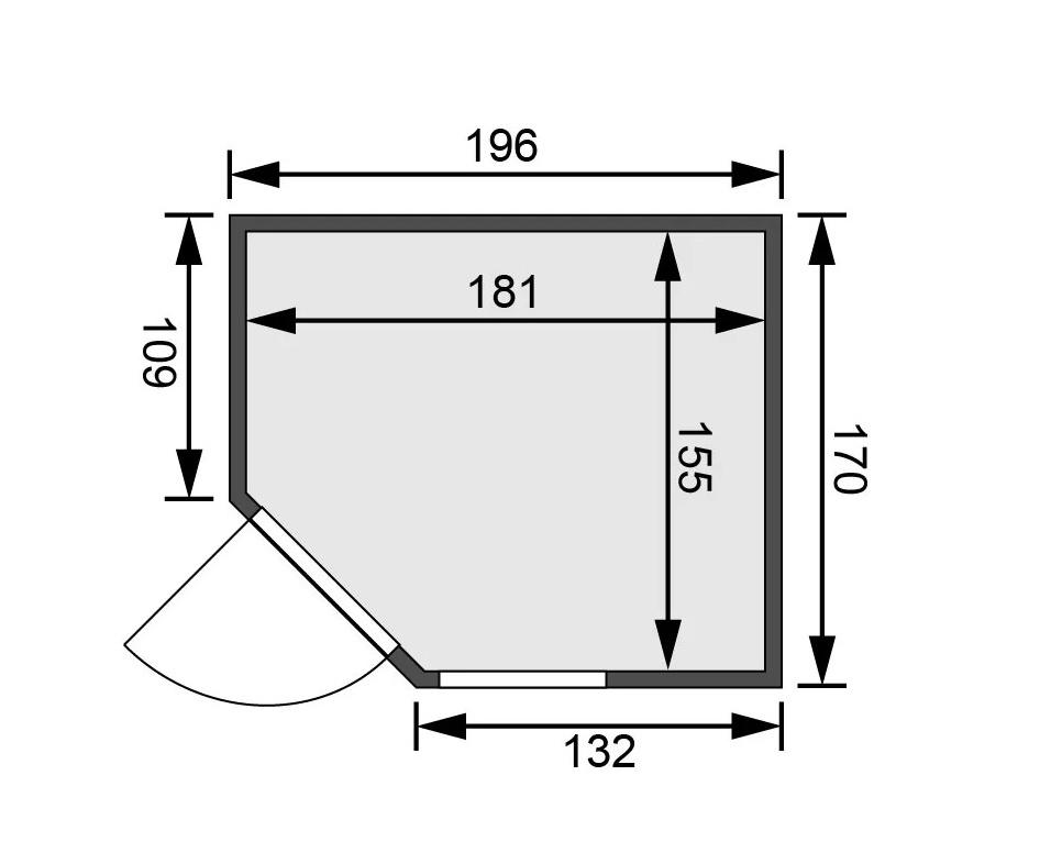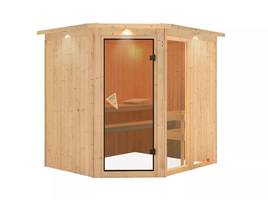 Fińska sauna przeznaczona dla dwóch osób. Wymiary: sz 196 cm, gł 170 cm, w 198 cm, z narożnymi drzwiami. Ten model sauny fińskiej posiada 1 okno o wymiarach sz 49 cm i w 175,5 cm. Sauna jest przeznaczona do ogrzewanych wnętrz domu lub mieszkania. Jej producent, firma KARIBU HOLZTECHNIK z niemieckiego Bremy, z powodzeniem nawiązała swoimi produktami do wielowiekowej tradycji skandynawskiego saunowania, jednocześnie wprowadzając do niej nowoczesne technologie. Sauna jest w całości wykonana z drewna świerku skandynawskiego w naturalnym wykończeniu. Drewno pochodzi z odległej północy Europy i jest całkowicie nieprzetworzone chemicznie (nie jest ani impregnowane, ani lakierowane). W efekcie jest wolne od wszelkich znanych substancji problematycznych, które mogłyby uwalniać się z drewna podczas saunowania. Ta wewnętrzna sauna cechuje się wyjątkowymi właściwościami termoizolacyjnymi. Ściany sauny składają się z wewnętrznej i zewnętrznej warstwy specjalnie wygładzonych desek z piórem i wpustem, pomiędzy którymi znajduje się 42-milimetrowa izolacja termiczna z wełny mineralnej. Całkowita grubość ściany wynosi zatem 68 mm. Tylnia, niewidoczna strona sauny, przylegająca do ściany pomieszczenia, jest pokryta powierzchnią z płyty pilśniowej.