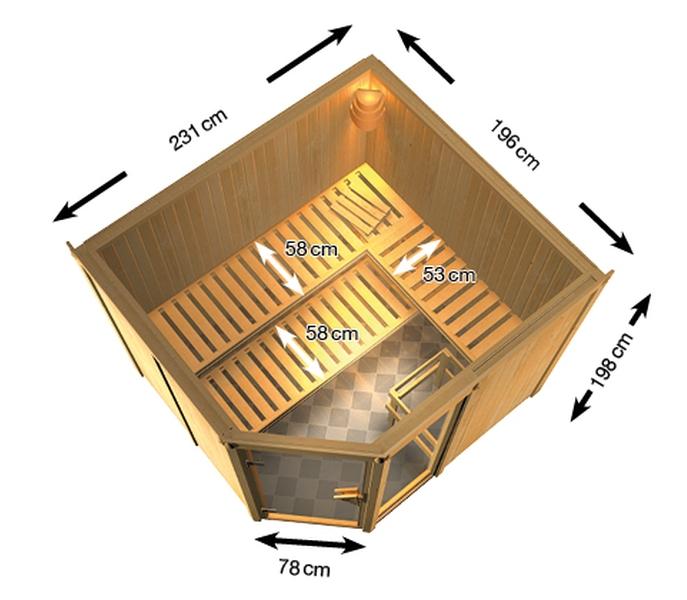 Fińska sauna przeznaczona dla dwóch osób. Wymiary: sz 231 cm, gł 196 cm, w 198 cm, z narożnymi drzwiami. Ten model sauny fińskiej posiada 1 okno o wymiarach sz 49 cm i w 175,5 cm. Sauna jest przeznaczona do ogrzewanych wnętrz domu lub mieszkania. Jej producent, firma KARIBU HOLZTECHNIK z niemieckiego Bremy, z powodzeniem nawiązała swoimi produktami do wielowiekowej tradycji skandynawskiego saunowania, jednocześnie wprowadzając do niej nowoczesne technologie. Sauna jest w całości wykonana z drewna świerku skandynawskiego w naturalnym wykończeniu. Drewno pochodzi z odległej północy Europy i jest całkowicie nieprzetworzone chemicznie (nie jest ani impregnowane, ani lakierowane). W efekcie jest wolne od wszelkich znanych substancji problematycznych, które mogłyby uwalniać się z drewna podczas saunowania. Ta wewnętrzna sauna cechuje się wyjątkowymi właściwościami termoizolacyjnymi. Ściany sauny składają się z wewnętrznej i zewnętrznej warstwy specjalnie wygładzonych desek z piórem i wpustem, pomiędzy którymi znajduje się 42-milimetrowa izolacja termiczna z wełny mineralnej. Całkowita grubość ściany wynosi zatem 68 mm. Tylnia, niewidoczna strona sauny, przylegająca do ściany pomieszczenia, jest pokryta powierzchnią z płyty pilśniowej.