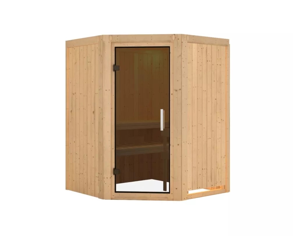 Mała sauna fińska przeznaczona dla maksymalnie dwóch osób. Ma wymiary sz 151 x gł 151 x w 198 cm z drzwiami narożnymi. Ten model sauny fińskiej przeznaczony jest do wnętrz o umiarkowanej temperaturze w domu lub mieszkaniu. Jej producent, firma KARIBU HOLZTECHNIK z Bremy w Niemczech, potrafiła swoimi produktami z sukcesem nawiązać do stuletniej tradycji saun skandynawskich, a jednocześnie włączyć do niej współczesne, nowoczesne technologie. Sauna w całości wykonana jest z drewna świerkowego nordyckiego o naturalnym wyglądzie. Drewno pochodzi z dalekiej północy Europy i jest całkowicie nieobrobione chemicznie (nie bejcowane ani lakierowane). Dzięki temu pozbawione jest wszelkich znanych, problematycznych substancji, które mogłyby wydzielać się z drewna podczas korzystania z sauny. Ta sauna wewnętrzna ma wyjątkowe właściwości termoizolacyjne. Ściany sauny składają się z wewnętrznej i zewnętrznej warstwy specjalnie wygładzonych desek na pióro i wpust, pomiędzy którymi znajduje się izolacja termiczna w postaci wełny mineralnej o grubości 42 mm całkowita grubość ściany wynosi zatem 68 mm. Tylna lub boczna strona niewidoczna, zwrócona w stronę ściany pokoju, jest pokryta płytą pilśniową. Dlatego przy tej samej izolacji termicznej są one o około 10 mm cieńsze od widocznych boków obłożonych deskami.