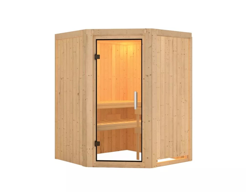 Mała sauna fińska przeznaczona dla maksymalnie dwóch osób. Ma wymiary sz 151 x gł 151 x w 198 cm z drzwiami narożnymi. Ten model sauny fińskiej przeznaczony jest do wnętrz o umiarkowanej temperaturze w domu lub mieszkaniu. Jej producent, firma KARIBU HOLZTECHNIK z Bremy w Niemczech, potrafiła swoimi produktami z sukcesem nawiązać do stuletniej tradycji saun skandynawskich, a jednocześnie włączyć do niej współczesne, nowoczesne technologie. Sauna w całości wykonana jest z drewna świerkowego nordyckiego o naturalnym wyglądzie. Drewno pochodzi z dalekiej północy Europy i jest całkowicie nieobrobione chemicznie (nie bejcowane ani lakierowane). Dzięki temu pozbawione jest wszelkich znanych, problematycznych substancji, które mogłyby wydzielać się z drewna podczas korzystania z sauny. Ta sauna wewnętrzna ma wyjątkowe właściwości termoizolacyjne. Ściany sauny składają się z wewnętrznej i zewnętrznej warstwy specjalnie wygładzonych desek na pióro i wpust, pomiędzy którymi znajduje się izolacja termiczna w postaci wełny mineralnej o grubości 42 mm całkowita grubość ściany wynosi zatem 68 mm. Tylna lub boczna strona niewidoczna, zwrócona w stronę ściany pokoju, jest pokryta płytą pilśniową. Dlatego przy tej samej izolacji termicznej są one o około 10 mm cieńsze od widocznych boków obłożonych deskami.