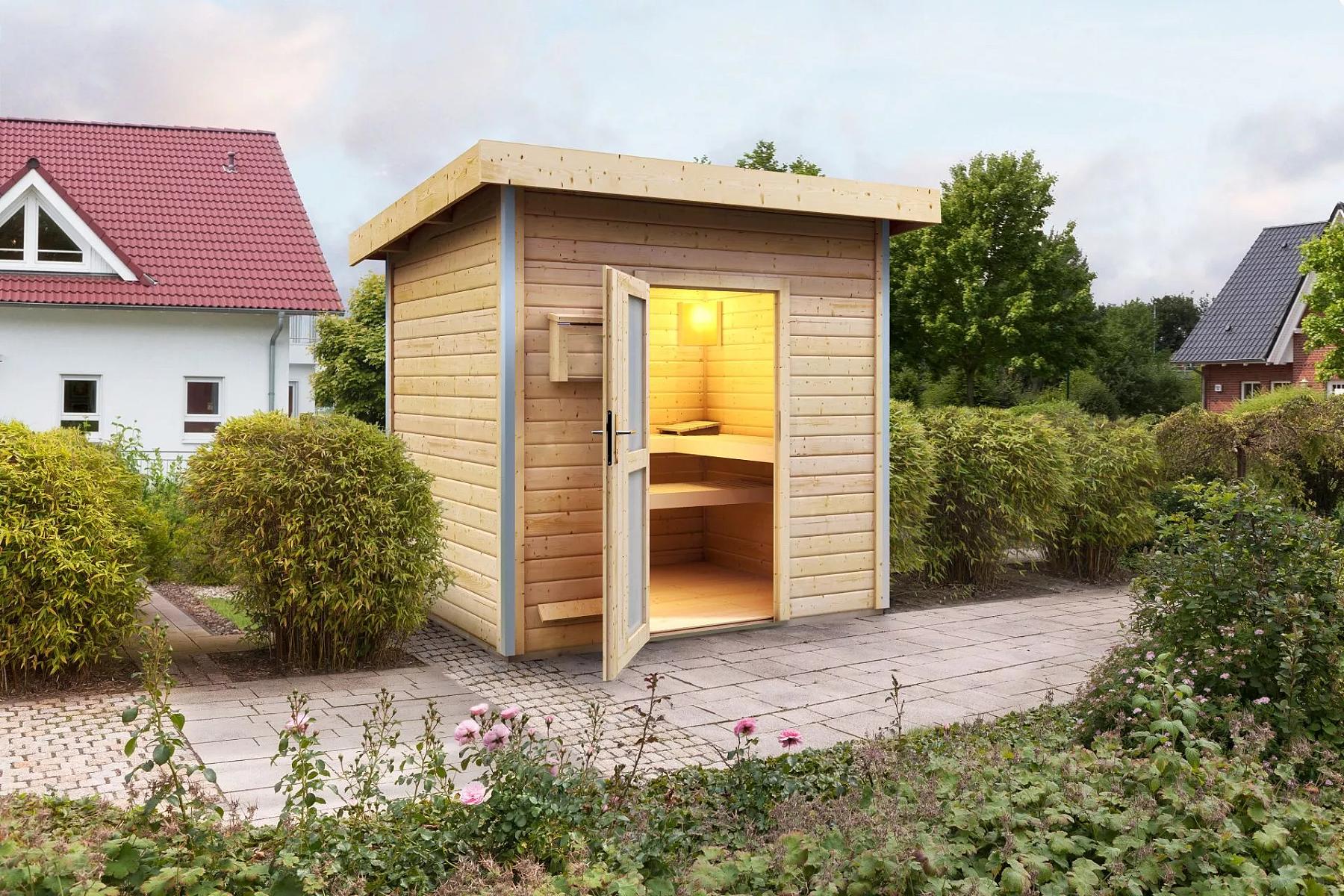 Zewnętrzny model sauny fińskiej do Twojego ogrodu. Sauna przeznaczona jest dla 3 osób leżących. Nowoczesny design z chromowanymi listwami narożnymi. Jej producent, firma KARIBU HOLZTECHNIK z niemieckiego Bremy, z powodzeniem nawiązała swoimi produktami do wielowiekowej tradycji skandynawskiego saunowania, jednocześnie wprowadzając do niej współczesne technologie. Dostarczamy ją jako zestaw w stanie rozłożonym, gdzie ściany składają się z pojedynczych drewnianych profili, które wystarczy połączyć i skręcić, a dach stanowi jednolita płyta. To gwarantuje prosty montaż, który wykona każdy majsterkowicz. Ściany sauny wykonane są ze specjalnie wygładzonych desek z podwójnym piórem i wpustem, co gwarantuje niezwykłą trwałość połączenia. Aby ciepło z wnętrza sauny nie mogło uciekać, zamontowano drugi sufit z konstrukcją ramową i wełną mineralną o grubości 42 mm.