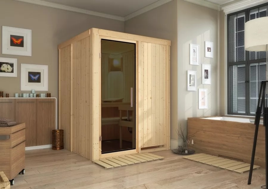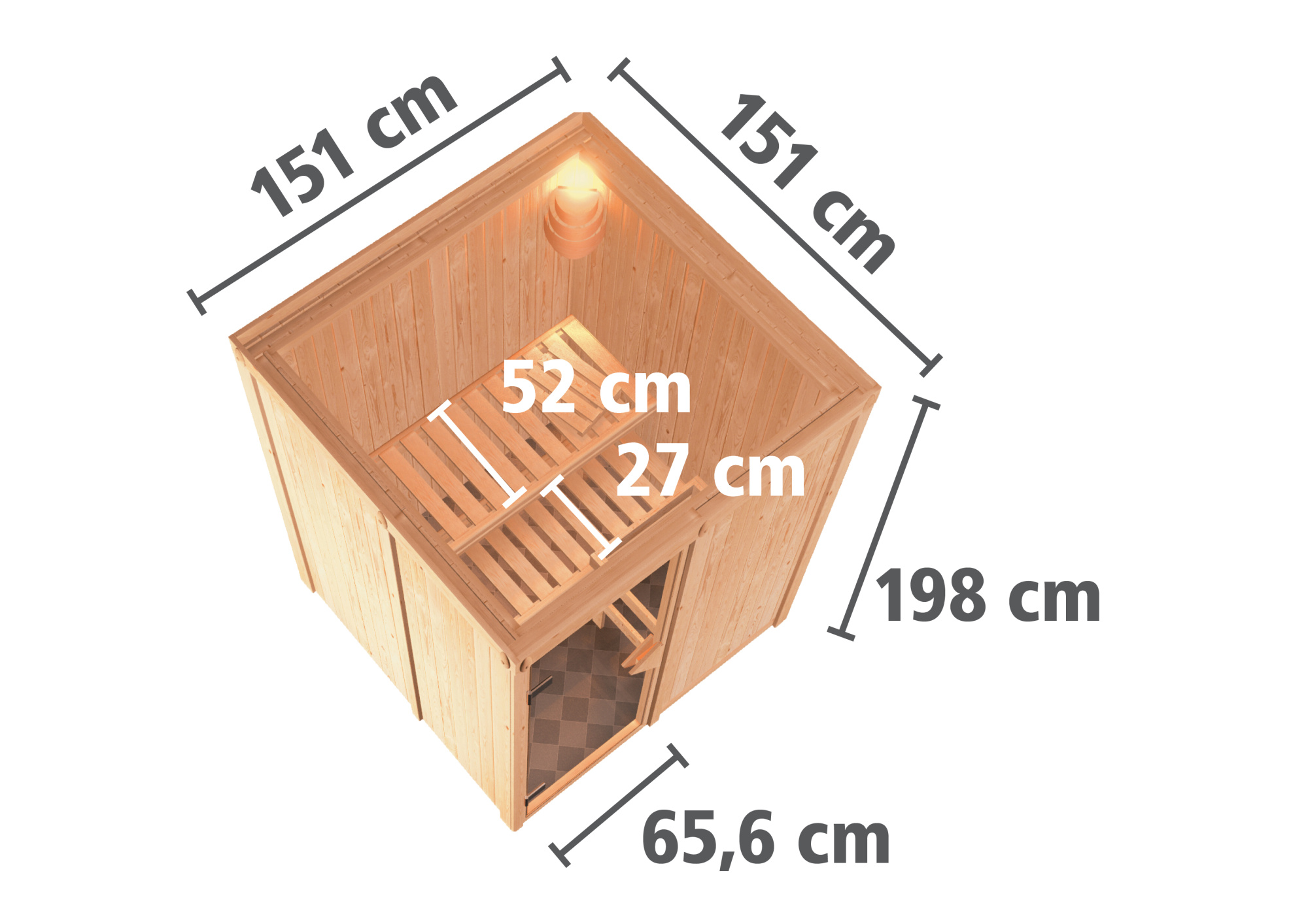 Sauna fińska przeznaczona dla dwóch osób w pozycji leżącej. Jej niewielkie wymiary kwadratowe sz 151 x gł 151 x w 198 cm predestynowały ją do mniejszych mieszkań. Ten model sauny fińskiej przeznaczony jest do wnętrz o umiarkowanej temperaturze w domu lub mieszkaniu. Jej producent, firma KARIBU HOLZTECHNIK z Bremy w Niemczech, potrafiła swoimi produktami z sukcesem nawiązać do wielowiekowej tradycji saun skandynawskich, a jednocześnie włączyć do niej współczesne, nowoczesne technologie. Sauna w całości wykonana jest z drewna świerkowego nordyckiego o naturalnym wyglądzie. Drewno pochodzi z dalekiej północy Europy i jest całkowicie nieobrobione chemicznie (nie bejcowane ani lakierowane). Dzięki temu pozbawione jest wszelkich znanych, problematycznych substancji, które mogłyby wydzielać się z drewna podczas korzystania z sauny. Ta sauna wewnętrzna ma wyjątkowe właściwości termoizolacyjne. Ściany sauny składają się z wewnętrznej i zewnętrznej warstwy specjalnie wygładzonych desek na pióro i wpust, pomiędzy którymi znajduje się izolacja termiczna w postaci wełny mineralnej o grubości 42 mm. Całkowita grubość ściany wynosi zatem 68 mm. Tylne lub boczne niewidoczne strony zwrócone w stronę ściany pomieszczenia mają zewnętrzną część wykonaną z płyty pilśniowej. Dlatego przy tej samej izolacji termicznej są one o około 10 mm cieńsze od widocznych boków obłożonych deskami.