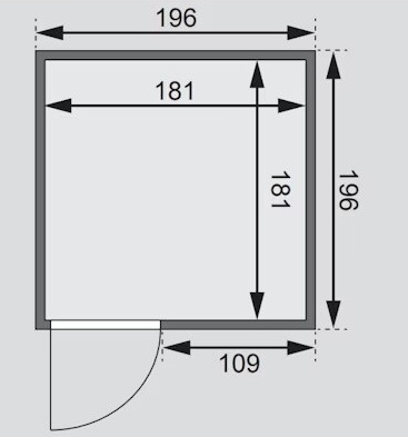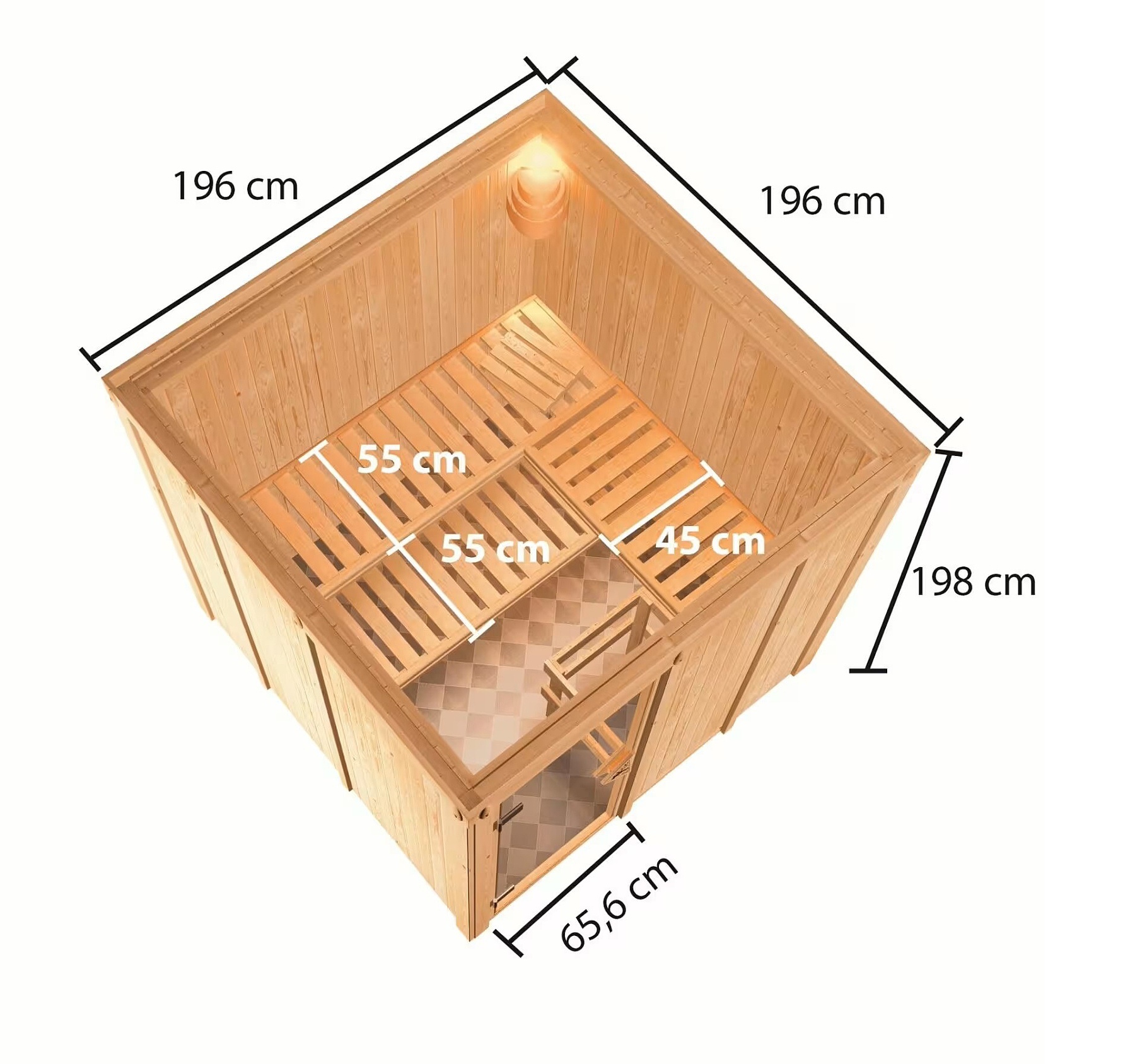 Sauna fińska przeznaczona dla trzech osób. Ma kwadratowy kształt o wymiarach: sz 196 cm, gł 196 cm, w 198 cm. Ten model sauny fińskiej jest przeznaczony do ogrzewanych wnętrz domu lub mieszkania. Jej producent, firma KARIBU HOLZTECHNIK z niemieckiego Bremy, z powodzeniem nawiązał swoimi produktami do wielowiekowej tradycji skandynawskiego saunowania, jednocześnie wprowadzając do niej nowoczesne technologie. Sauna jest w całości wykonana z drewna świerku skandynawskiego w naturalnym wykończeniu. Drewno pochodzi z odległej północy Europy i jest całkowicie nieprzetworzone chemicznie (nie jest ani impregnowane, ani lakierowane). W efekcie jest wolne od wszelkich znanych substancji problematycznych, które mogłyby uwalniać się z drewna podczas saunowania. Ta wewnętrzna sauna cechuje się wyjątkowymi właściwościami termoizolacyjnymi. Ściany sauny składają się z wewnętrznej i zewnętrznej warstwy specjalnie wygładzonych desek z piórem i wpustem, pomiędzy którymi znajduje się 42-milimetrowa izolacja termiczna z wełny mineralnej. Całkowita grubość ściany wynosi zatem 68 mm. Tylnie lub boczne niewidoczne strony, przylegające do ściany pomieszczenia, mają zewnętrzną warstwę wykonaną z płyty pilśniowej. Dlatego przy zachowaniu tej samej izolacji termicznej są o około 10 mm cieńsze niż widoczne strony pokryte deskami.