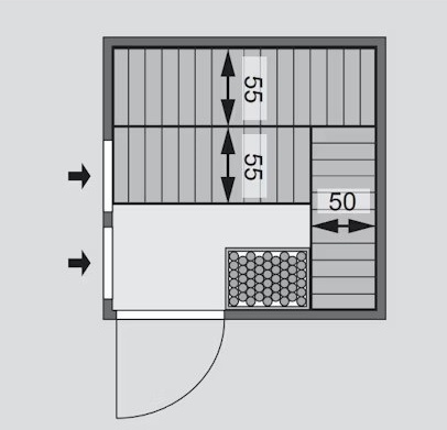 Sauna nie ma własnej podłogi i należy ją umieścić wyłącznie w pomieszczeniu z odpowiednią wykładziną podłogową, najlepiej płytkami. Saunę dostarczamy w wersji bez listwy sufitowej (profilu) przy suficie, wraz z oświetleniem LED 3 x 7,5 W.