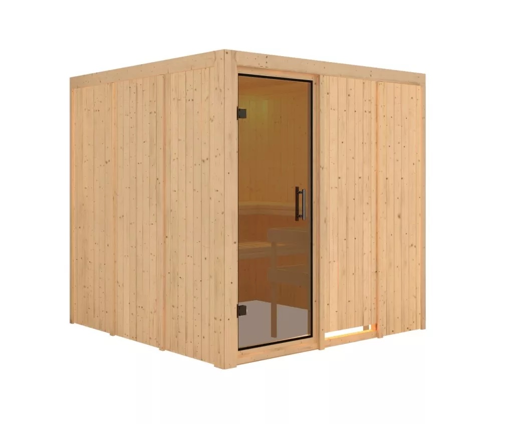 Fińska sauna przeznaczona dla dwóch leżących osób. Ma kwadratowy kształt o wymiarach sz 196 x gł 196 x w 198 cm. Ten model sauny fińskiej jest przeznaczony do ogrzewanych wnętrz domu lub mieszkania. Jej producent, firma KARIBU HOLZTECHNIK z niemieckich Brem, z powodzeniem nawiązał swoimi produktami do wielowiekowej tradycji skandynawskiego saunowania, jednocześnie wdrażając nowoczesne technologie. Sauna jest w całości wykonana z drewna świerku skandynawskiego w naturalnym wykończeniu. Drewno pochodzi z dalekiej północy Europy i jest całkowicie niepoddane obróbce chemicznej (nie jest ani bejcowane, ani lakierowane). Dzięki temu jest wolne od wszystkich znanych szkodliwych substancji, które mogłyby uwalniać się z drewna podczas saunowania.Ta sauna wewnętrzna charakteryzuje się wyjątkowymi właściwościami termoizolacyjnymi. Ściany sauny składają się z wewnętrznej i zewnętrznej warstwy specjalnie wygładzonych desek z piórem i wpustem, pomiędzy którymi znajduje się 42-milimetrowa izolacja termiczna z wełny mineralnej. Całkowita grubość ściany wynosi zatem 68 mm. Tylne lub boczne niewidoczne strony, skierowane ku ścianie pomieszczenia, mają zewnętrzną stronę wykonaną z płyty pilśniowej. Dlatego przy tej samej izolacji termicznej są o około 10 mm cieńsze niż widoczne strony pokryte boazerią.