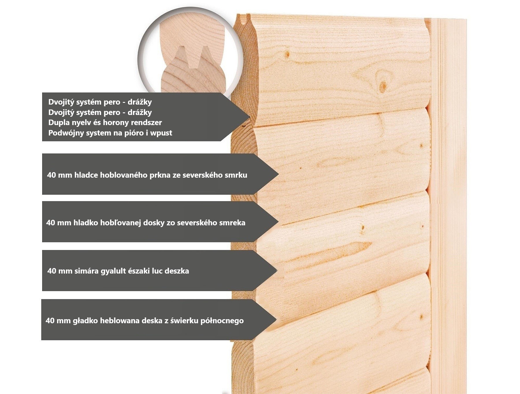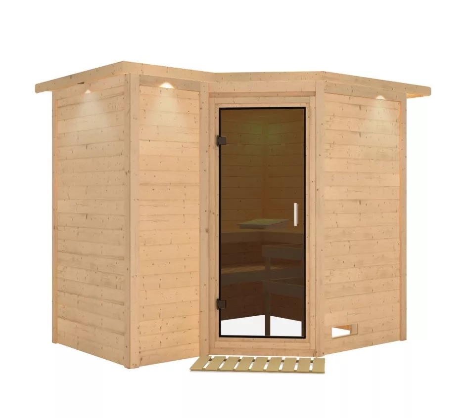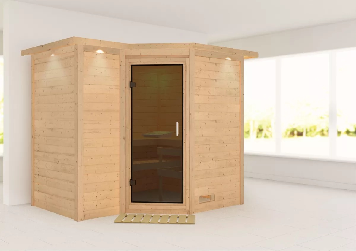 Fińska sauna przeznaczona dla trzech leżących osób. Ma wymiary sz 264 x gł 198 x w 213 cm. Ten model sauny fińskiej jest przeznaczony do ogrzewanych wnętrz domu lub mieszkania. Jej producent, firma KARIBU HOLZTECHNIK z niemieckich Brem, z powodzeniem nawiązał swoimi produktami do wielowiekowej tradycji skandynawskiego saunowania, jednocześnie wdrażając nowoczesne technologie. Sauna jest w całości wykonana z drewna świerku skandynawskiego w naturalnym wykończeniu. Drewno pochodzi z dalekiej północy Europy i jest całkowicie niepoddane obróbce chemicznej (nie jest ani bejcowane, ani lakierowane). Dzięki temu jest wolne od wszystkich znanych szkodliwych substancji, które mogłyby się uwalniać z drewna podczas saunowania. Ta sauna wewnętrzna jest wykonana z litego drewna o grubości 40 mm. Ściany sauny składają się ze specjalnie wygładzonych desek z podwójnym piórem i wpustem, co gwarantuje niezwykłą wytrzymałość połączenia.