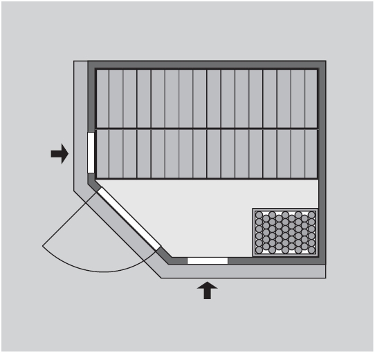 Sauna nie ma własnej podłogi i należy ją umieścić wyłącznie w pomieszczeniu z odpowiednią wykładziną podłogową, najlepiej płytkami. Saunę dostarczamy w wersji bez listwy sufitowej (profilu) przy suficie, wraz z oświetleniem LED 3 x 7,5 W.