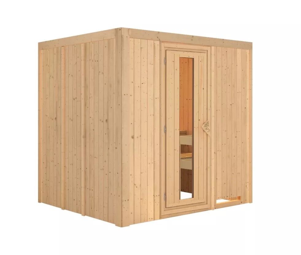 Fińska sauna przeznaczona dla dwóch leżących osób. Ma prostokątny kształt o wymiarach sz 196 x gł 170 x w 198 cm. Ten model sauny fińskiej jest przeznaczony do ogrzewanych wnętrz domu lub mieszkania. Jej producent, firma KARIBU HOLZTECHNIK z niemieckich Brem, z powodzeniem nawiązał swoimi produktami do wielowiekowej tradycji skandynawskiego saunowania, jednocześnie wdrażając w nią nowoczesne technologie. Sauna jest w całości wykonana z drewna świerku skandynawskiego w naturalnym wykończeniu. Drewno pochodzi z dalekiej północy Europy i jest całkowicie niepoddane obróbce chemicznej (nie jest ani bejcowane, ani lakierowane). Dzięki temu jest wolne od wszystkich znanych szkodliwych substancji, które mogłyby się uwalniać z drewna podczas saunowania. Ta sauna wewnętrzna charakteryzuje się wyjątkowymi właściwościami termoizolacyjnymi. Ściany sauny składają się z wewnętrznej i zewnętrznej warstwy specjalnie wygładzonych desek na pióro i wpust, pomiędzy którymi znajduje się 42-milimetrowa izolacja termiczna z wełny mineralnej. Całkowita grubość ściany wynosi zatem 68 mm. Tylne lub boczne niewidoczne strony, skierowane ku ścianie pomieszczenia, mają zewnętrzną stronę wykonaną z płyty pilśniowej. Dlatego przy tej samej izolacji termicznej są o około 10 mm cieńsze niż widoczne strony pokryte boazerią.