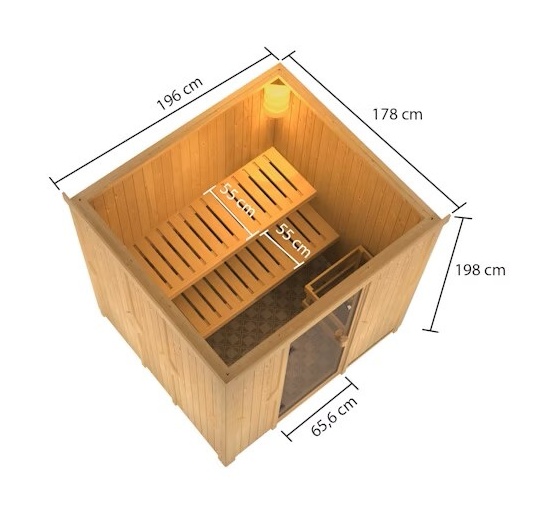 Sauna fińska przeznaczona dla dwóch osób leżących. Ma wymiary: sz 196 cm, gł 178 cm, w 198 cm. Ten model sauny fińskiej jest przeznaczony do ogrzewanych wnętrz domu lub mieszkania. Jej producent, firma KARIBU HOLZTECHNIK z niemieckiego Bremy, z powodzeniem nawiązał swoimi produktami do wielowiekowej tradycji skandynawskiego saunowania, jednocześnie wprowadzając do niej nowoczesne technologie. Sauna jest w całości wykonana z drewna świerku skandynawskiego w naturalnym wykończeniu. Drewno pochodzi z odległej północy Europy i jest całkowicie nieprzetworzone chemicznie (nie jest ani impregnowane, ani lakierowane). W efekcie jest wolne od wszelkich znanych substancji problematycznych, które mogłyby uwalniać się z drewna podczas saunowania. Ta wewnętrzna sauna cechuje się wyjątkowymi właściwościami termoizolacyjnymi. Ściany sauny składają się z wewnętrznej i zewnętrznej warstwy specjalnie wygładzonych desek z piórem i wpustem, pomiędzy którymi znajduje się 42-milimetrowa izolacja termiczna z wełny mineralnej. Całkowita grubość ściany wynosi zatem 68 mm. Tylne lub boczne niewidoczne strony, przylegające do ściany pomieszczenia, mają zewnętrzną warstwę wykonaną z płyty pilśniowej. Dlatego przy zachowaniu tej samej izolacji termicznej są o około 10 mm cieńsze niż widoczne strony pokryte deskami.