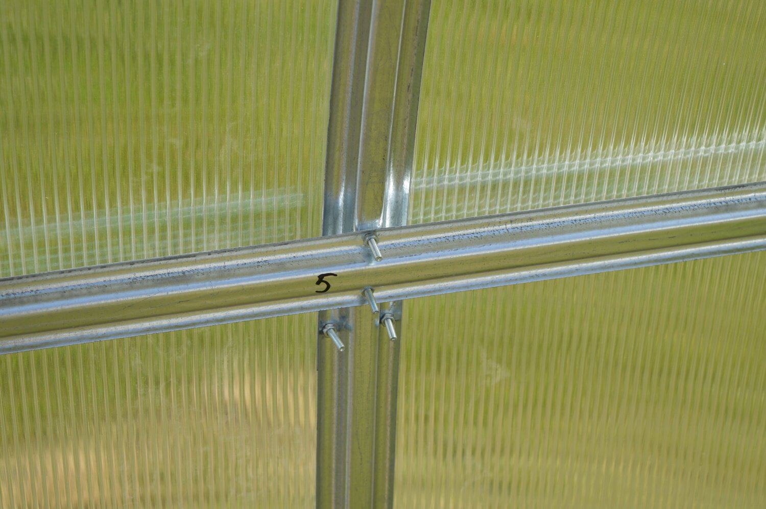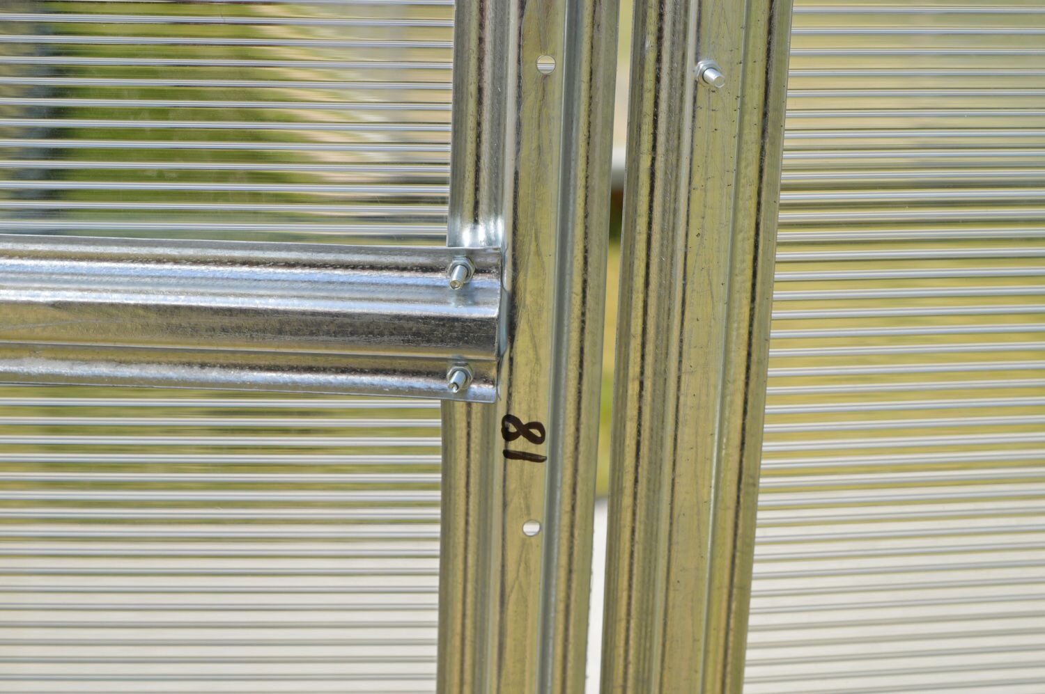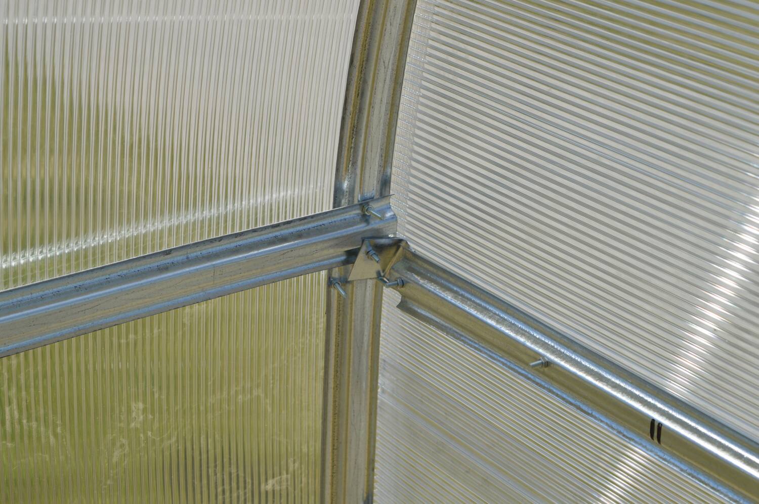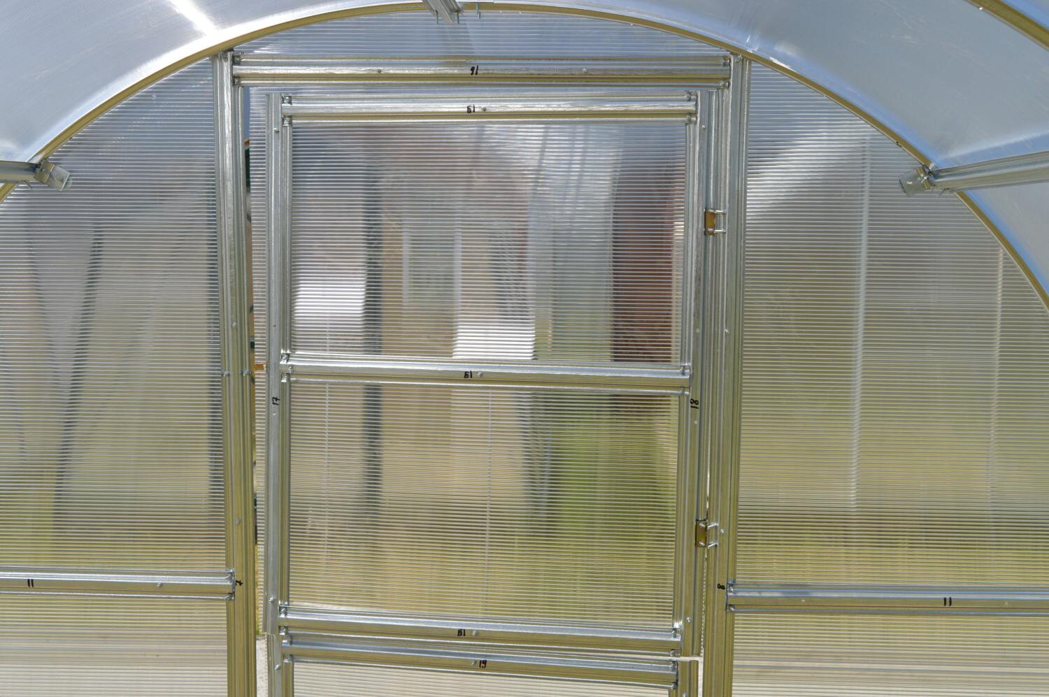Konstrukcja - konstrukcja szklarni skręcana jest z ocynkowanych profili omega o grubości 0,70 - 0,85 mm. Materiał profili jest ocynkowany. Poszczególne żebra łuków nośnych oddalone są od siebie o zaledwie 60-80 cm, co jest dużą zaletą tego modelu szklarni w porównaniu do innych produktów dostępnych na rynku czeskim. Mały rozstaw łuków wynoszący 0,6 - 0,7 m gwarantuje dużą nośność całej konstrukcji szklarni. W przedniej i tylnej ścianie szklarni wbudowane są podwójne drzwi, dzięki czemu możliwe jest przejście przez szklarnię z obu stron. Jeśli otworzysz górną część drzwi na obu końcach szklarni, zapewnisz sobie komfortową wentylację całej szklarni bez dostępu dzieci i zwierząt. Jeśli nie chcesz montować drugich drzwi z tyłu szklarni, istnieje możliwość umieszczenia w ścianie okna wentylacyjnego, w którym możesz zamontować automatyczny otwieracz LANITPLAST (do dokupienia jako wyposażenie dodatkowe).