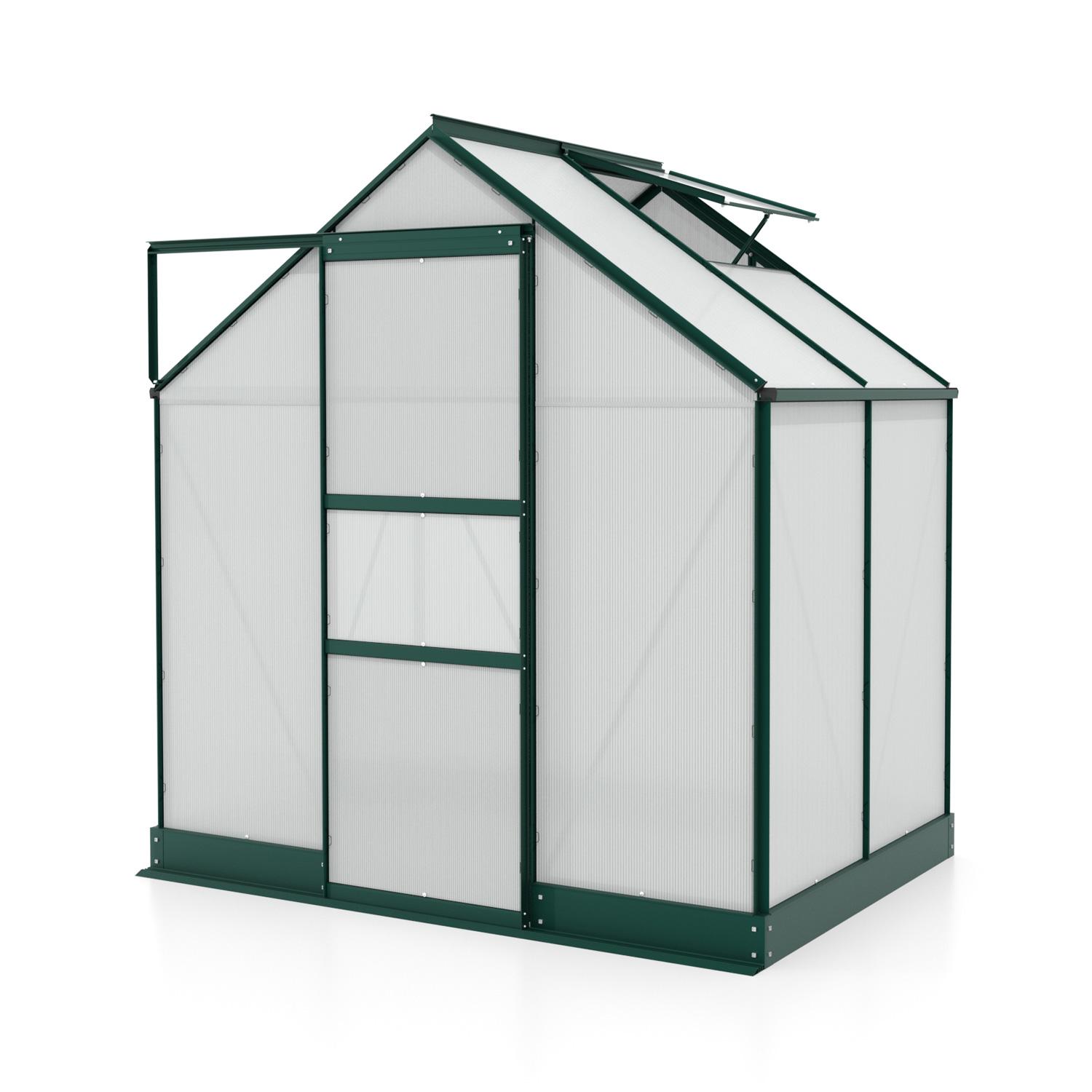 Szklarnia aluminiowa, sz 1,95 x gł 1,37 m, kolor zielony, 1x okno dachowe, poliwęglan 6 mm, podstawa w cenie, powierzchnia 2,67 m2.