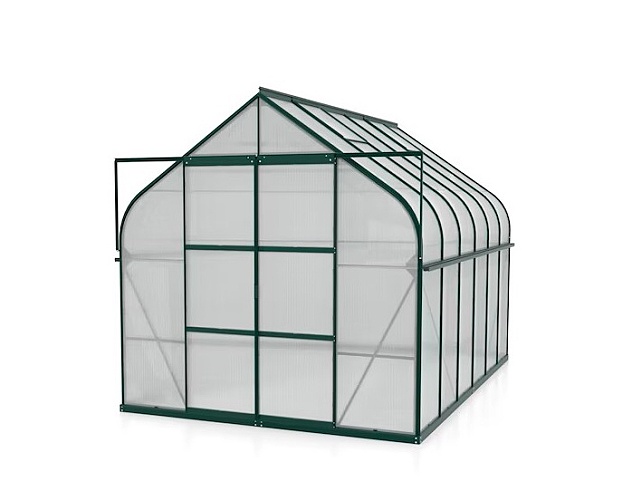 Szklarnia aluminiowa, sz 2,64 x gł 3,21 m, kolor zielony, 2x okno dachowe, poliwęglan o grubości 4 mm z Wielkiej Brytanii, pow 8,47 m2.