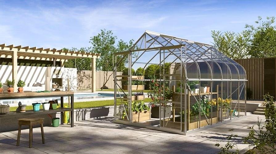 Szklarnia aluminiowa, sz 2,64 x gł 3,83 m, kolor srebrny, 4x okno dachowe, poliwęglan o grubości 4 mm z Wielkiej Brytanii, pow 10,11 m2.