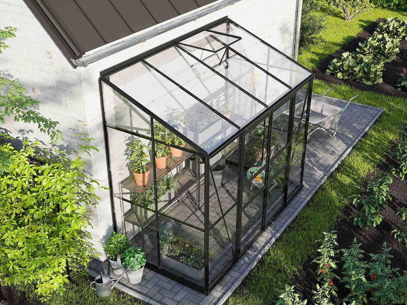Szklarnia aluminiowa do ściany, sz 2,55 x gł 1,32 m, kolor czarny, 1x okno dachowe, szkło hartowane przezroczyste 3 mm, pow 3,36 m2.