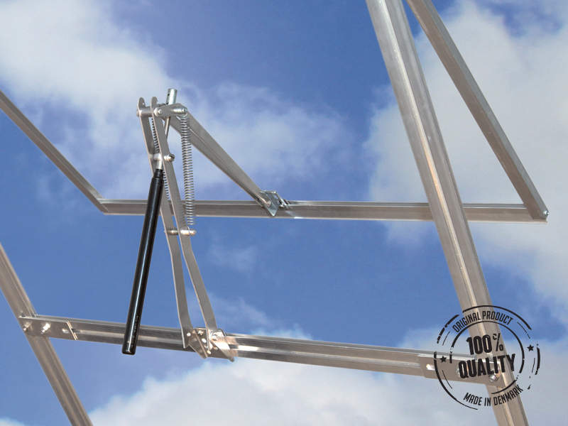 Automatyczny otwieracz do szyberdachu - tłoczek z dźwignią zastępujący otwieranie ręczne. Tłok działa w oparciu o rozszerzalność cieplną wosku i wraz ze wzrostem temperatury w szklarni przesuwa/przesuwa dźwignię i otwiera okno. Konstrukcja otwieracza okna jest srebrna, tłok jest czarny. Otwarcie można regulować w zakresie temperatur od 7o C do 25o C. Wysokość otwarcia ok. 45 cm, siła otwierania ok. 7 kg.
