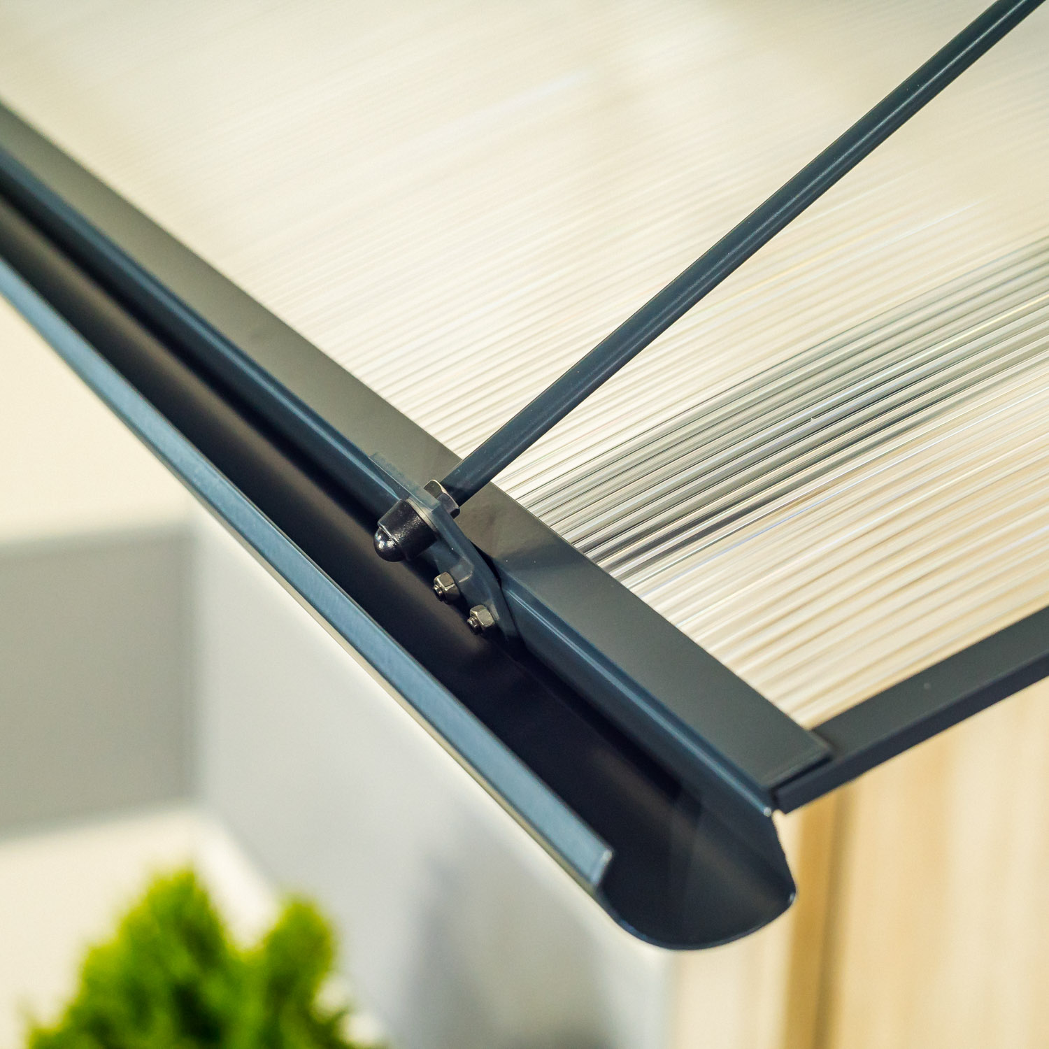 Uniwersalna ściana boczna aluminiowa w kolorze antracytowym do daszka drzwiowego, 310 x 600 x 1850 mm, przezroczysty poliwęglan komórkowy 4,5 mm.