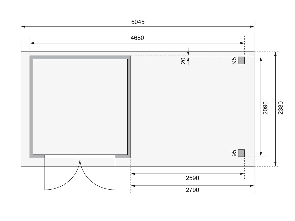 Ta wersja domku zawiera otwartą oficyna o długości 280 cm, którą można zamontować z prawej lub lewej strony.