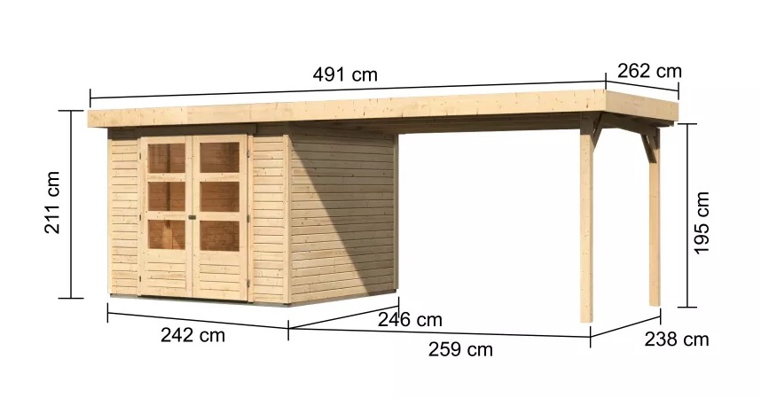 Ta wersja domku zawiera otwartą oficyna o długości 280 cm, którą można zamontować z prawej lub lewej strony.