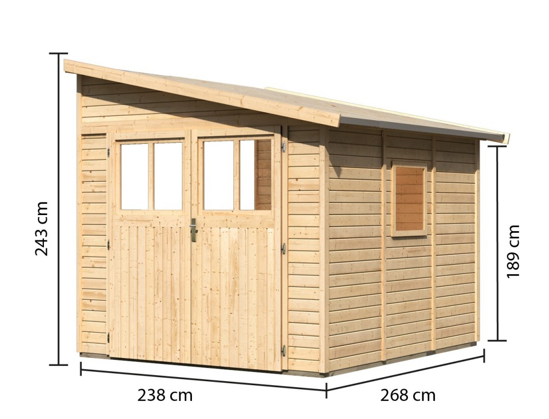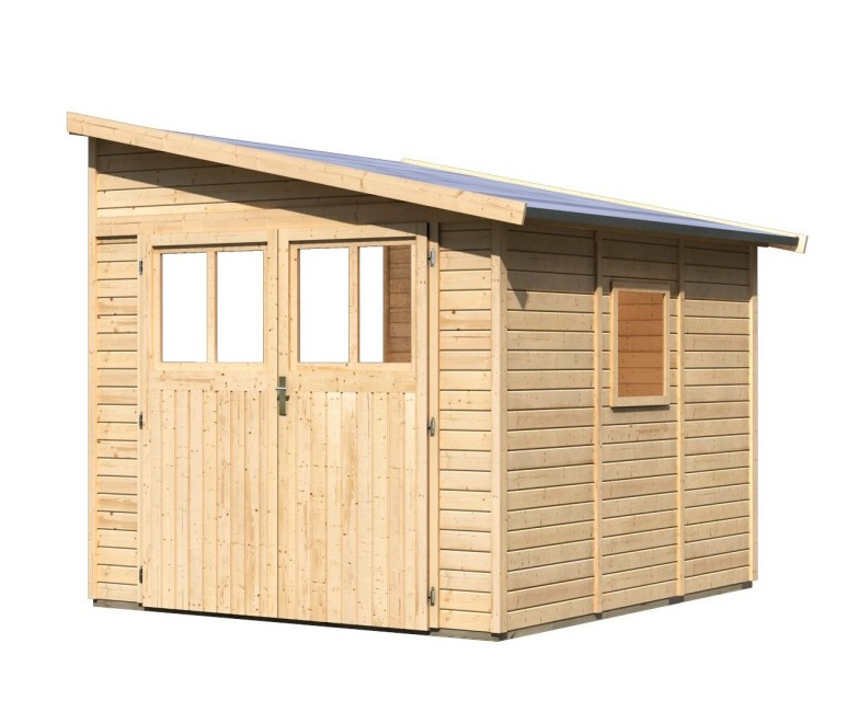 Drewniany dom do ściany. W domu można przechowywać sprzęt ogrodowy, narzędzia lub zbudować w nim warsztat majsterkowania. Dom ma dwuspadowy dach i jedne dwuskrzydłowe drzwi na zawiasach z oknem w każdym skrzydle. Materiałem konstrukcyjnym domu są profile drewniane o grubości 19 mm, doskonale wyfrezowane ze świerku nordyckiego. Dostarczamy go w zestawie w stanie rozłożonym, gdzie ściany składają się z pojedynczych profili drewnianych, które wystarczy złożyć i skręcić. Gwarantuje to wyjątkowo prosty montaż, z którym poradzi sobie każdy majsterkowicz.