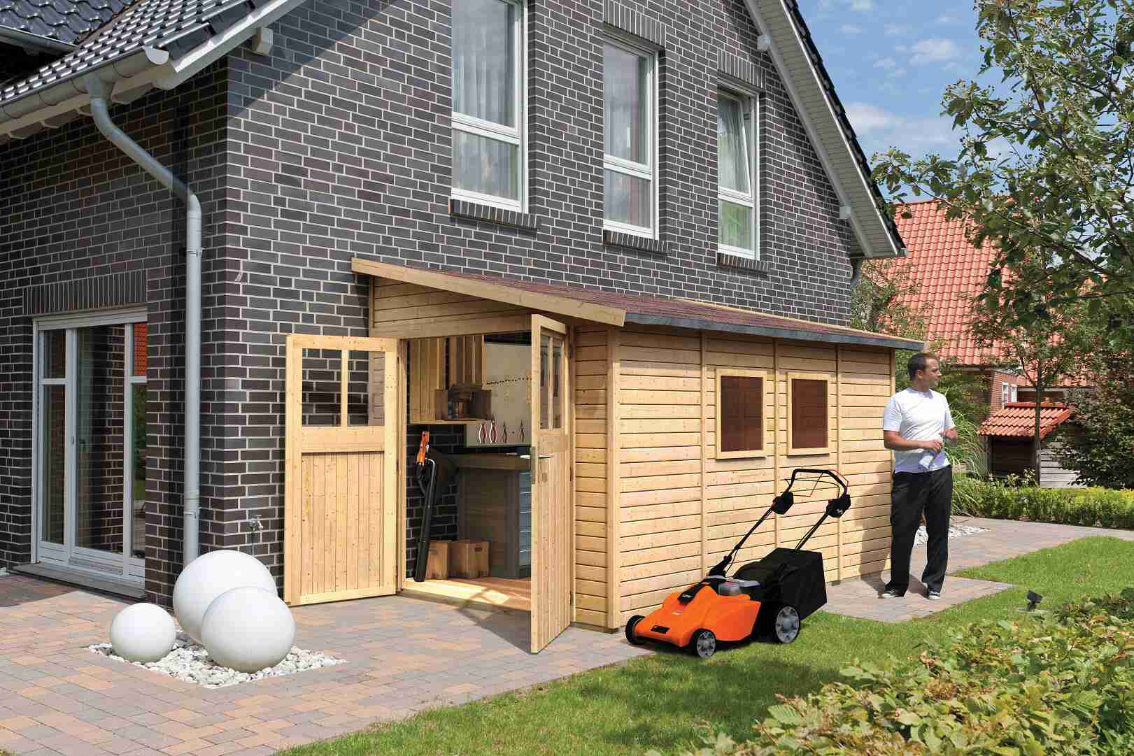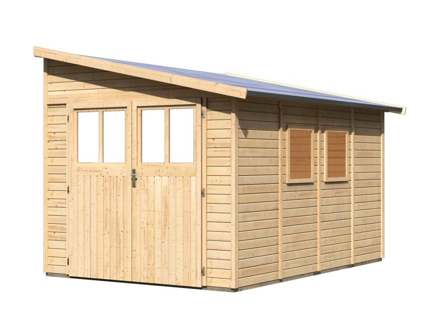 Drewniany dom do ściany. W domu można przechowywać sprzęt ogrodowy, narzędzia lub zbudować w nim warsztat majsterkowania. Dom ma dwuspadowy dach i jedne dwuskrzydłowe drzwi na zawiasach z oknem w każdym skrzydle. Materiałem konstrukcyjnym domu są profile drewniane o grubości 19 mm, doskonale wyfrezowane ze świerku nordyckiego. Dostarczamy go w zestawie w stanie rozłożonym, gdzie ściany składają się z pojedynczych profili drewnianych, które wystarczy złożyć i skręcić. Gwarantuje to wyjątkowo prosty montaż, z którym poradzi sobie każdy majsterkowicz.