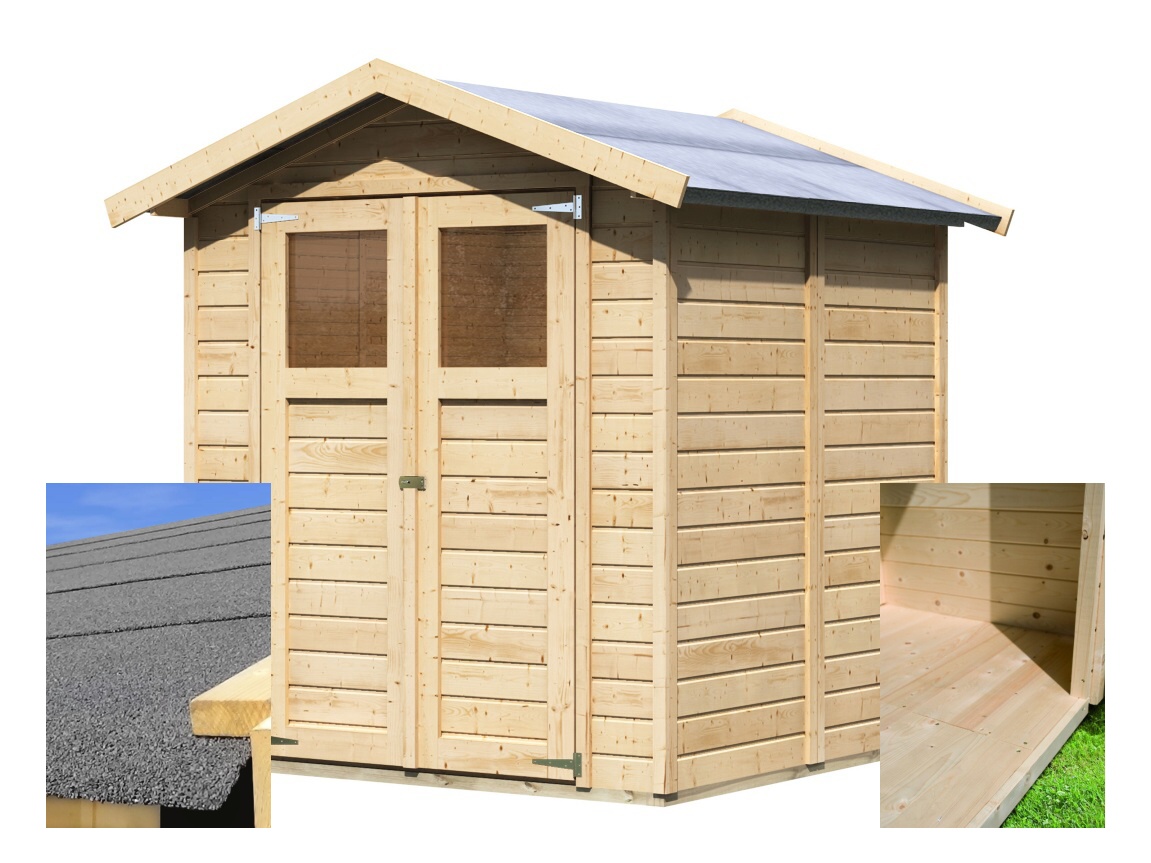 Podstawowy model drewnianego domku do ogrodu. Model ten ma dwuspadowy dach i podwójne drzwi na zawiasach z oknem w każdym skrzydle. Materiałem konstrukcyjnym domku są profile o grubości 14 mm idealnie wyfrezowane ze świerku nordyckiego. Dach wykonany jest z deski liściastej. Gwarantuje to niezwykle prosty montaż, z którym poradzi sobie każdy majsterkowicz.