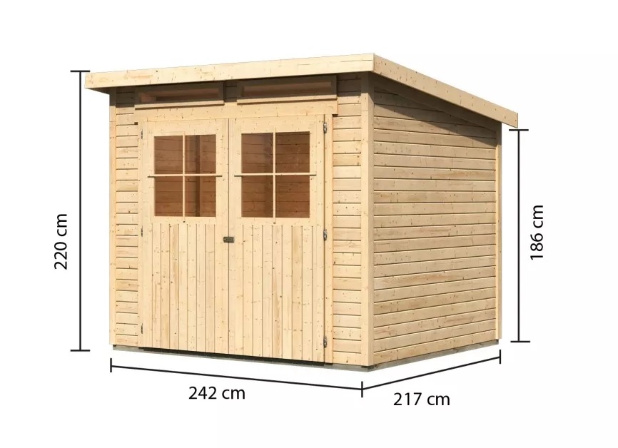 Podstawowy model drewnianego domu do Twojego ogrodu. Model ten posiada płaski dach oraz dwuskrzydłowe drzwi uchylne z oknem w każdym skrzydle. Materiałem konstrukcyjnym domu są profile drewniane o grubości 19 mm, doskonale wyfrezowane ze świerku nordyckiego. Dostarczamy go w zestawie w stanie rozłożonym, gdzie ściany składają się z pojedynczych profili drewnianych, które wystarczy złożyć i skręcić. Gwarantuje to wyjątkowo prosty montaż, z którym poradzi sobie każdy majsterkowicz.